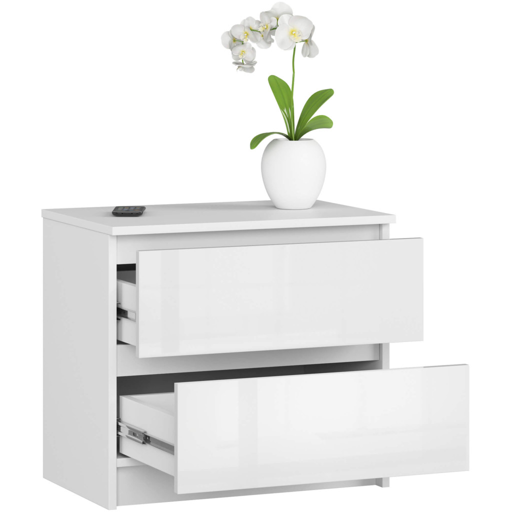 Modern, kétszemélyes fiókos komód magasfényű fehér akril frontokkal és matt fehér korpusszal. Kompakt méretének és időtlen dizájnjának köszönhetően tökéletes választás bármely hálószobába vagy nappaliba.