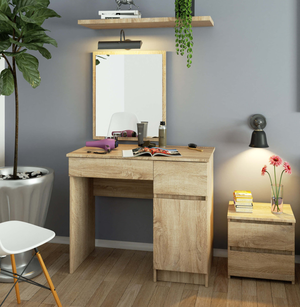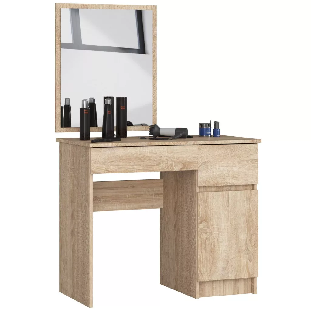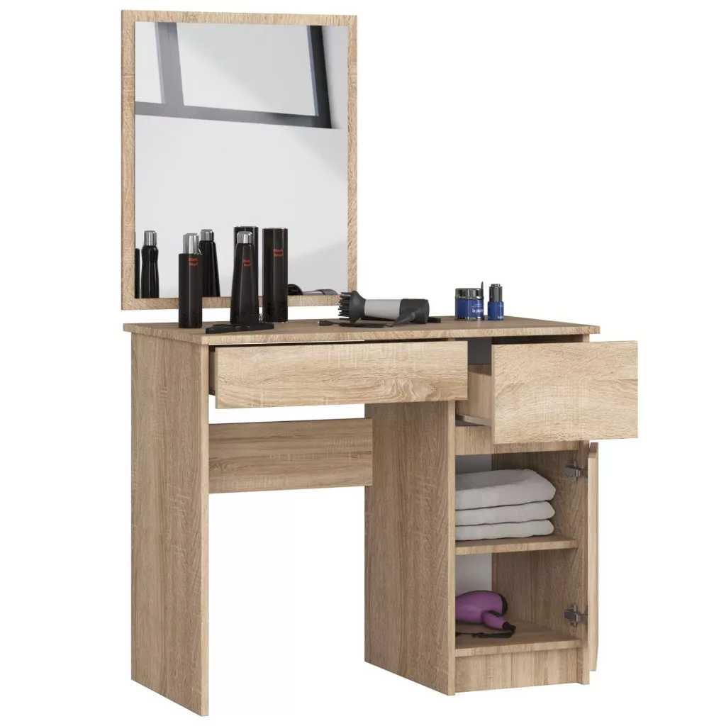 Modern és praktikus fésülködőasztal nagy tükörrel, két fiókkal és tágas szekrényrésszel Sonoma tölgy színben. Tökéletes választás hálószobákba és szépségszalonokba egyaránt.