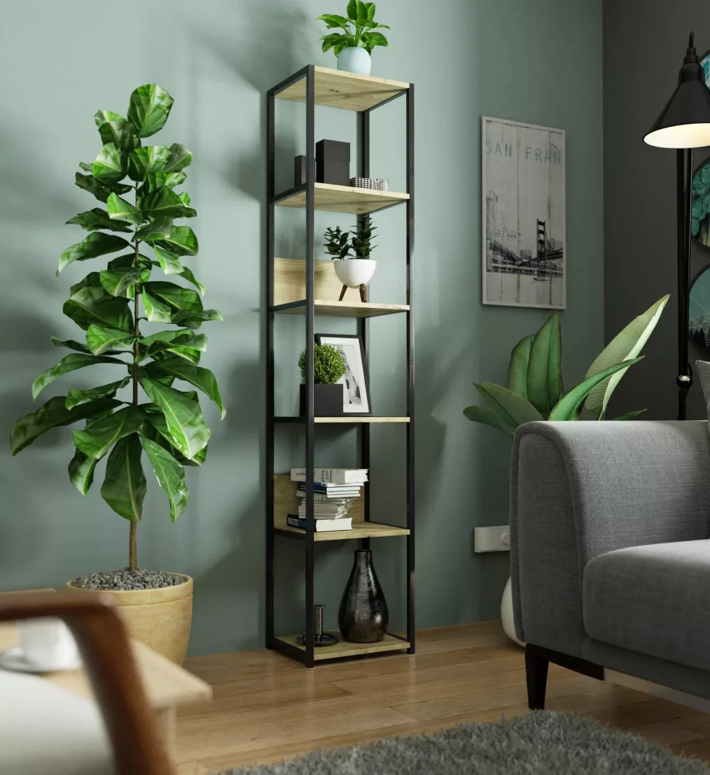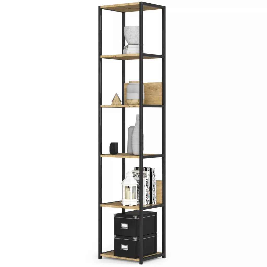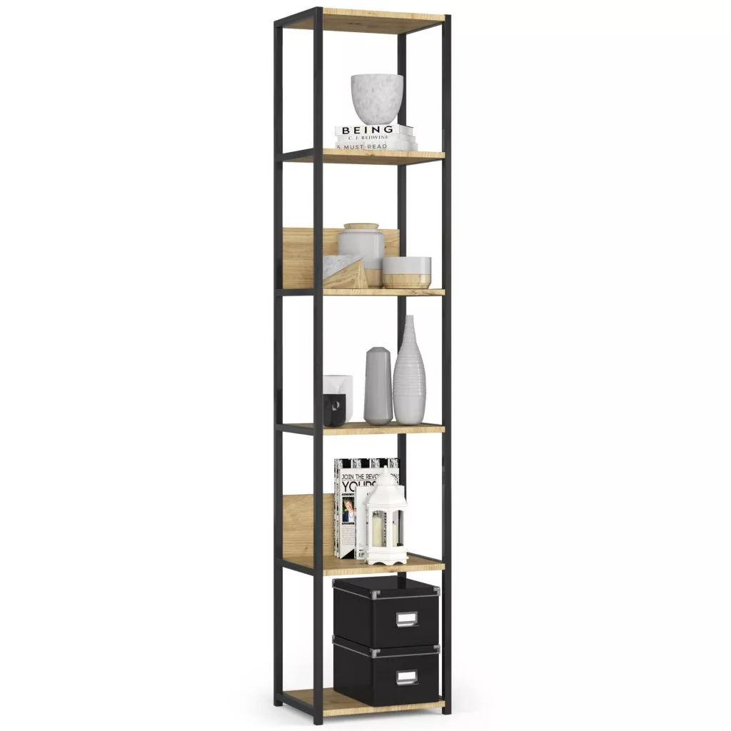 Modern és praktikus loft stílusú állvány 6 polccal, amely tökéletesen ötvözi a fekete fém váz és az artisan tölgy polcok eleganciáját. Ideális megoldás mind otthoni, mind irodai környezetben a tároló és kiállítótér kialakításához.