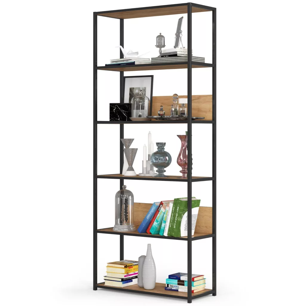 Modern, ipari stílusú polcos szekrény fekete fémvázas kivitelben és tölgy craft színű polcokkal. Hat praktikus polcával tökéletes tárolási megoldást kínál mind otthoni, mind irodai környezetben.
