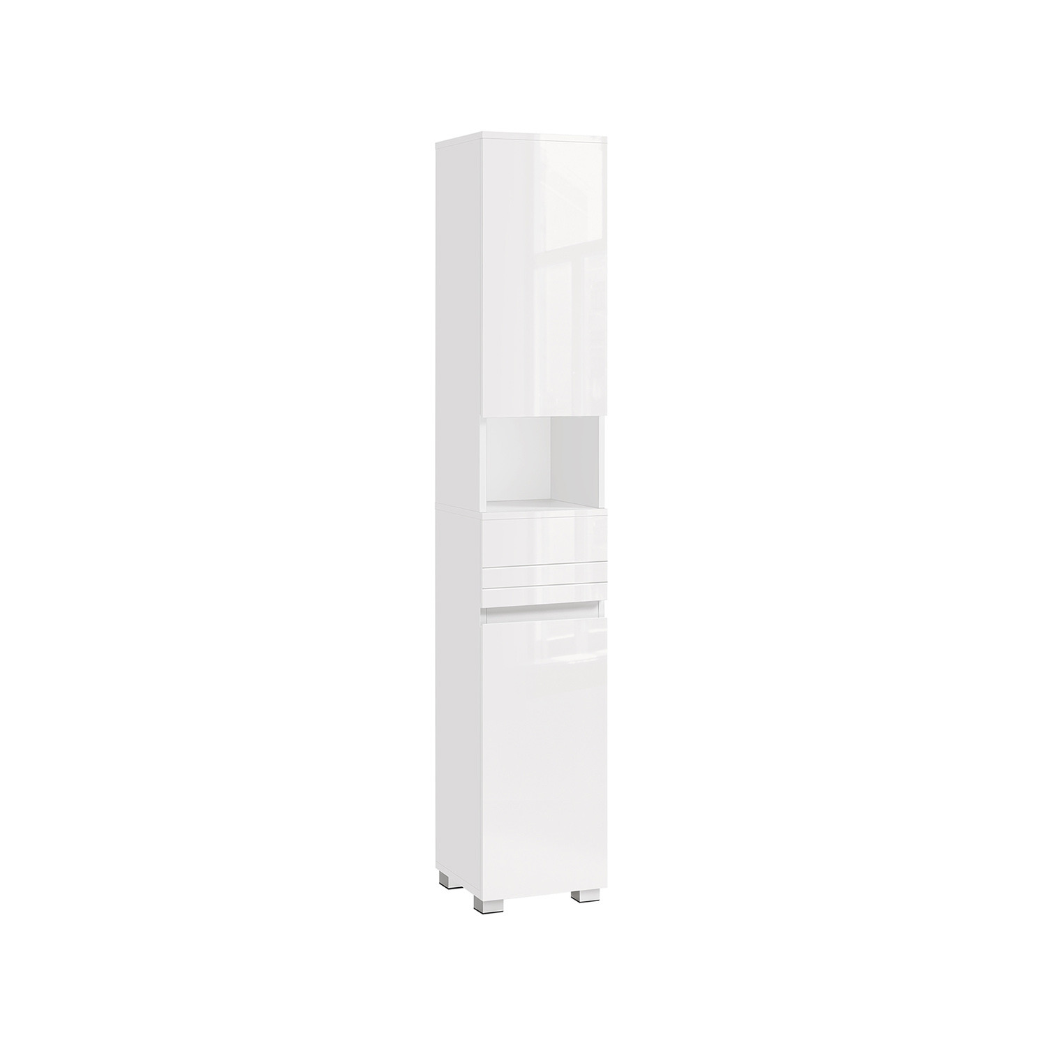Elegáns, karcsú kialakítású fürdőszobai állószekrény állítható polcokkal és fiókkal, amely maximális tárolási megoldást kínál kis helyeken.