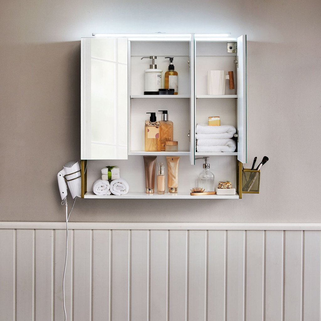 Elegáns, LED világítással ellátott fürdőszobai tükrös szekrény állítható polccal és praktikus tárolási megoldásokkal, fehér-arany színkombinációban.