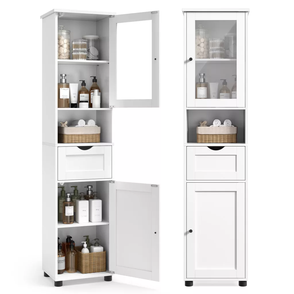Ez a karcsú, magas fürdőszobai szekrény tökéletes tárolási megoldást kínál kis helyiségekbe is. Az üvegajtós rekeszek, a nyitott polc és a fiók kombinációja elegáns és praktikus rendszert biztosít fürdőszobai kellékeid számára.
