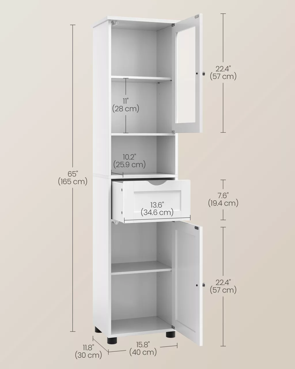 • Helytakarékos megoldás: A karcsú, 40 cm széles design tökéletes kis fürdőszobákba, miközben bőséges tárolóhelyet kínál