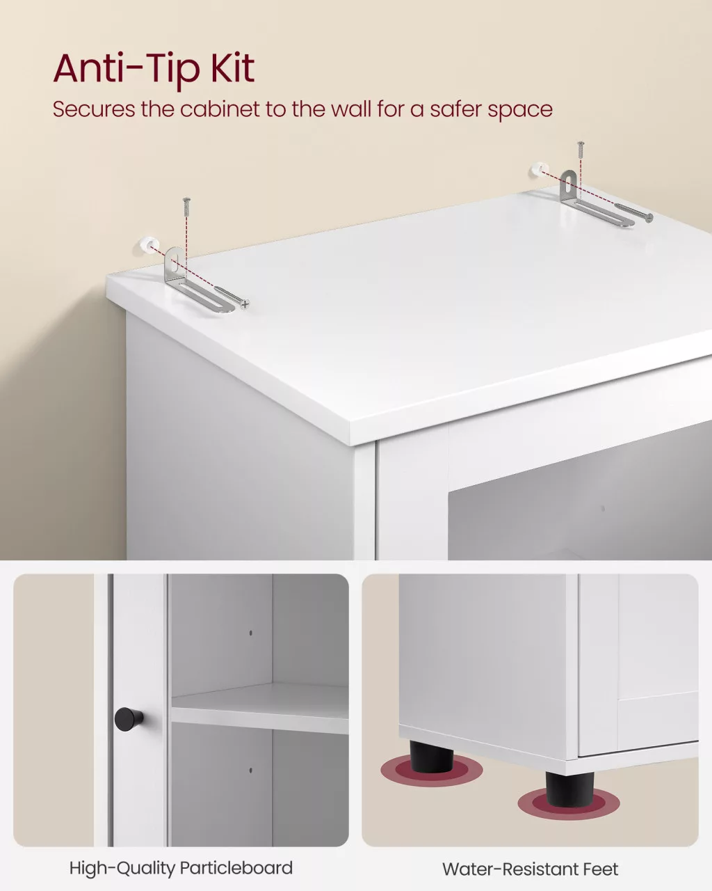 A szekrény négy vízálló műanyag lábbal rendelkezik, amelyek megvédik a bútort a padlón lévő víztől, így hosszú élettartamot garantálnak. Az elegáns fehér szín és az üvegajtó friss, modern megjelenést kölcsönöz fürdőszobádnak. A szekrény részletesen számozott alkatrészekkel és világos útmutatóval érkezik, így az összeszerelés gyors és egyszerű. A mellékelt falbilincselő készlet extra biztonságot nyújt családod számára.