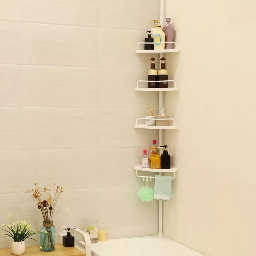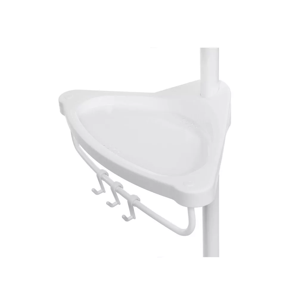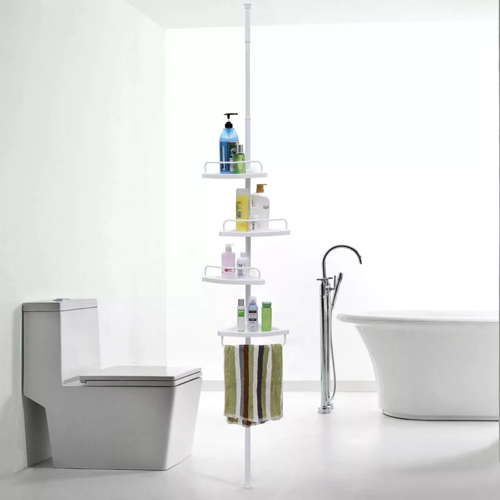 Ez a teleszkópos sarokpolc rendszer tökéletes megoldást nyújt a fürdőszobai kellékek rendszerezett tárolására. A padlótól a mennyezetig állítható magasságának (85-305 cm) köszönhetően bármilyen fürdőszobába beilleszthető, míg a négy háromszög alakú polc és a praktikus akasztók maximális helykihasználást biztosítanak.