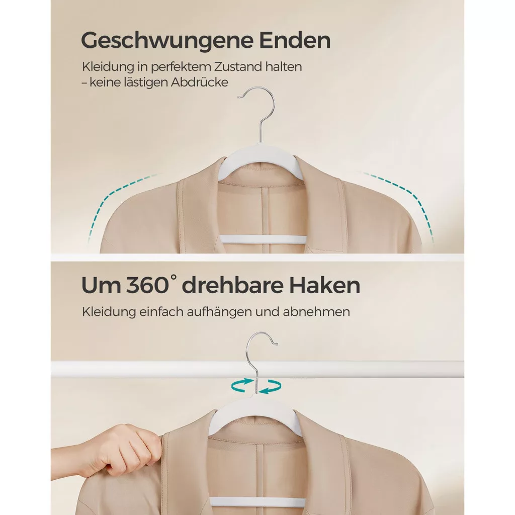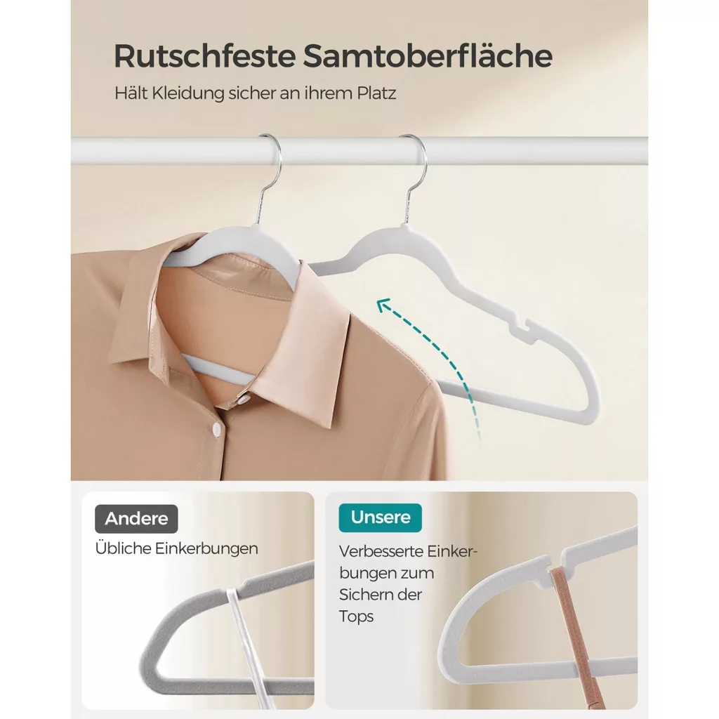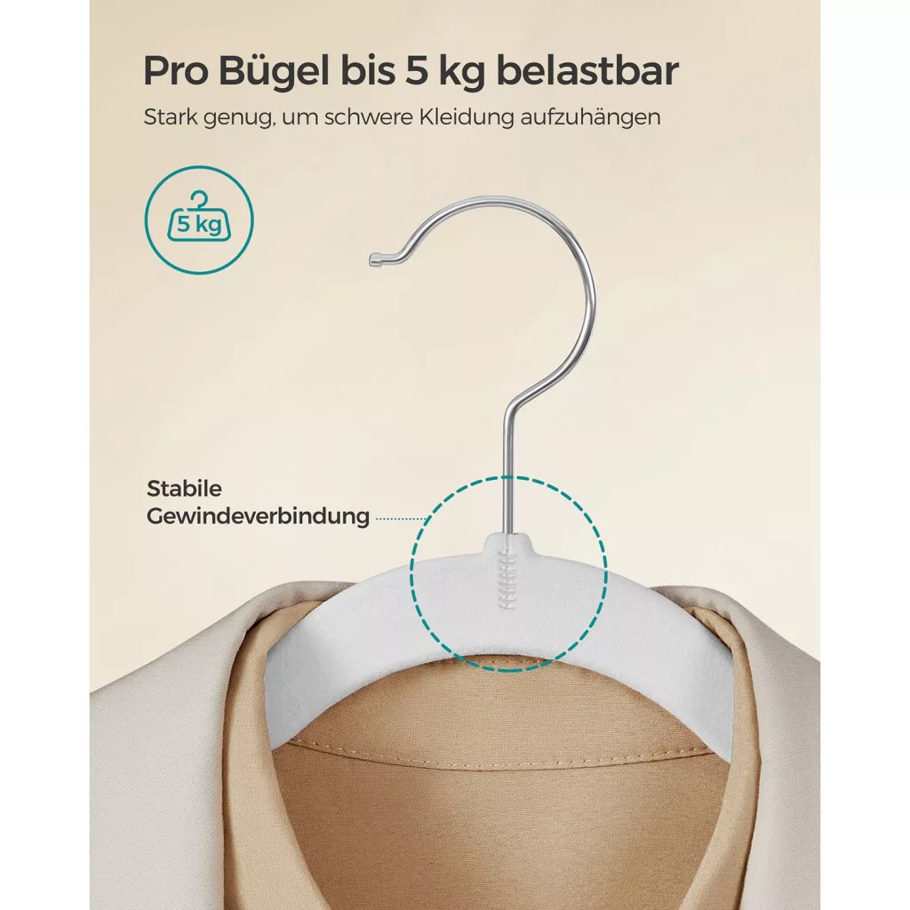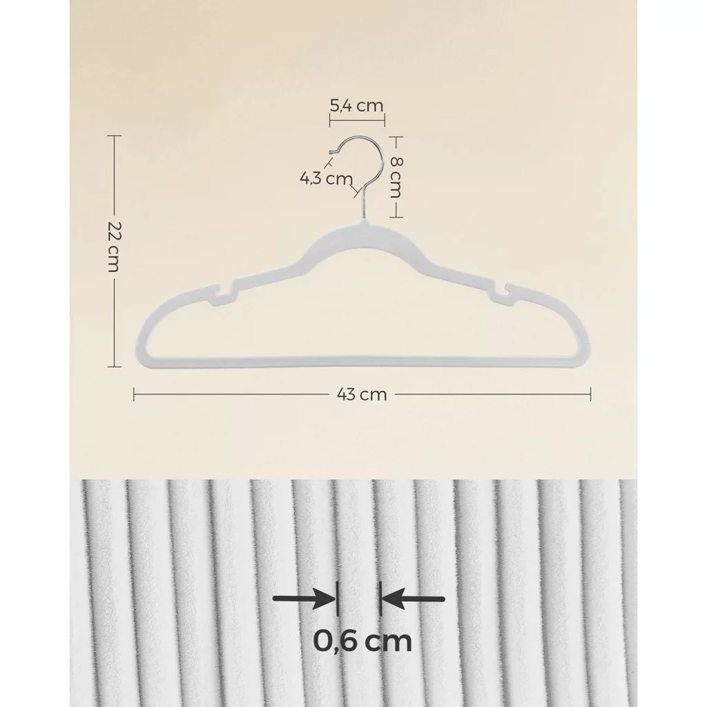 A SONGMICS bársony vállfa szett forradalmasítja ruhatárának rendszerezését. A mindössze 0,6 cm vékony kialakítás 30%-kal több helyet szabadít fel a szekrényben a hagyományos fa vállfákhoz képest, miközben a bársonyos felület megakadályozza a ruhák lecsúszását.
