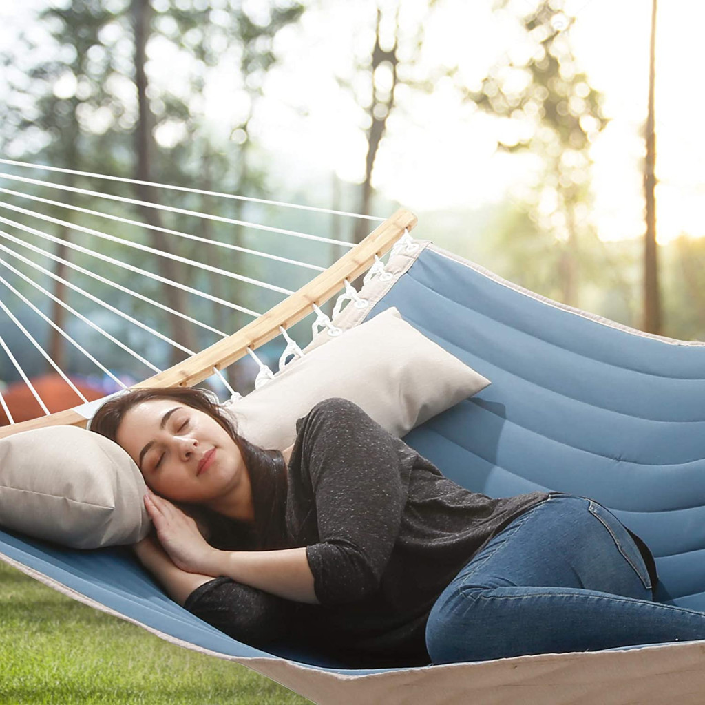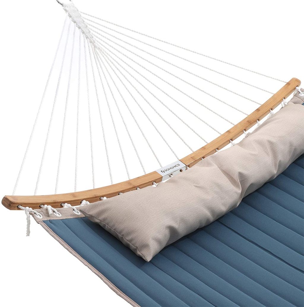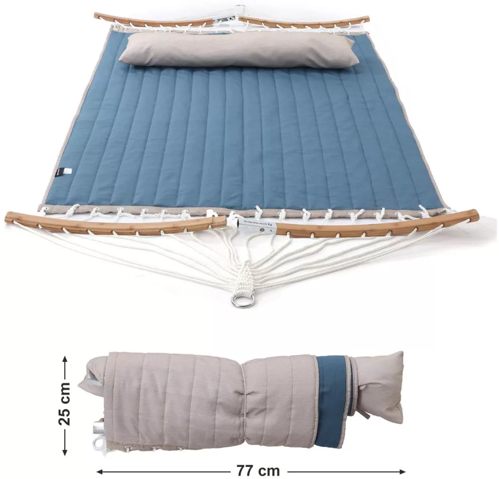 Extra stabil, párnázott dupla függőágy ívelt bambusz tartórudakkal, levehető párnával és 225 kg teherbírással a tökéletes kerti pihenéshez.