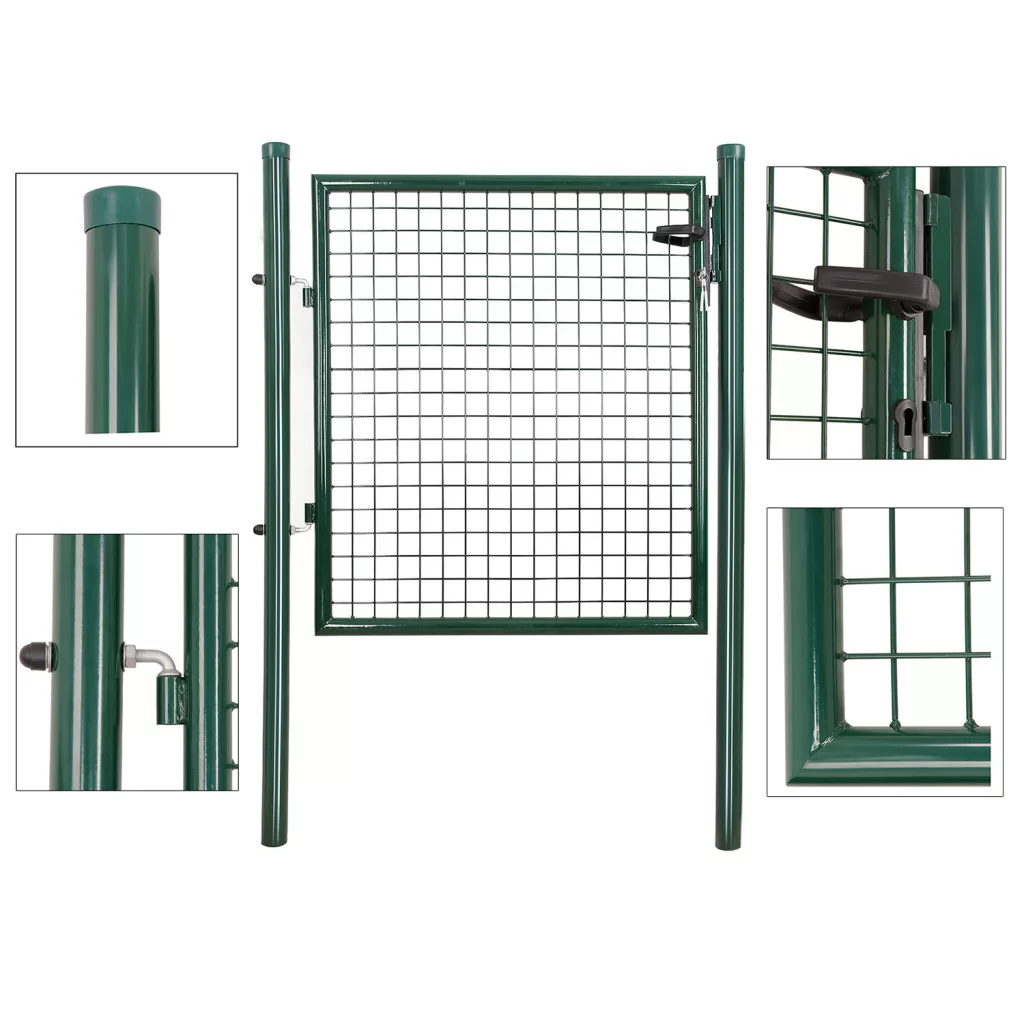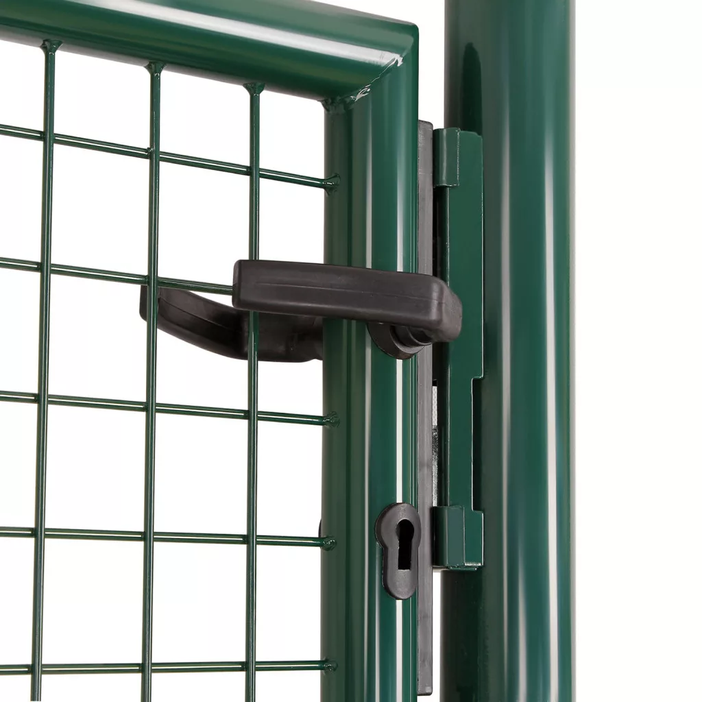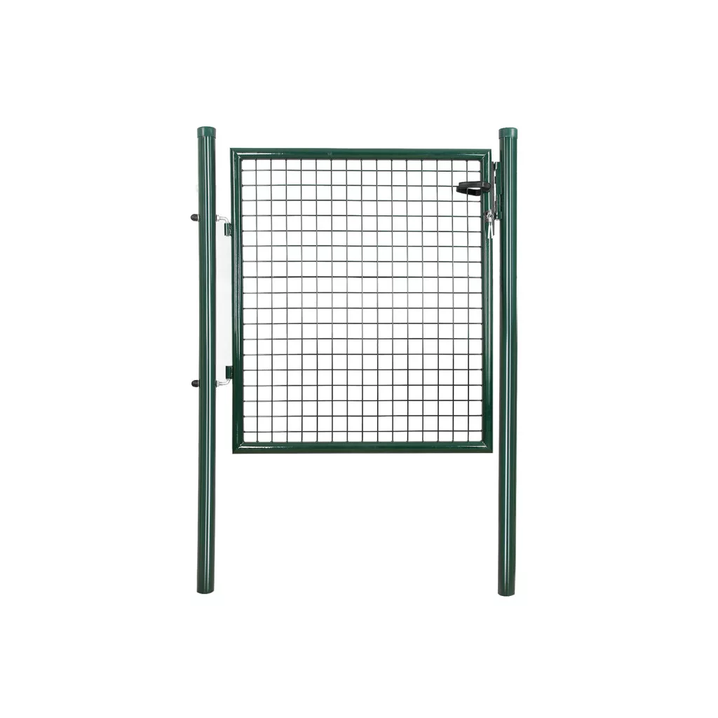 Ez a prémium minőségű kerti kapu horganyzott acélból készült, zöld porfestett bevonattal, amely maximális védelmet nyújt a rozsdásodás és korrózió ellen. A masszív szerkezet és az 50 x 50 mm-es rácsszerkezet tökéletes megoldást kínál a kert vagy telek biztonságos lezárásához.
