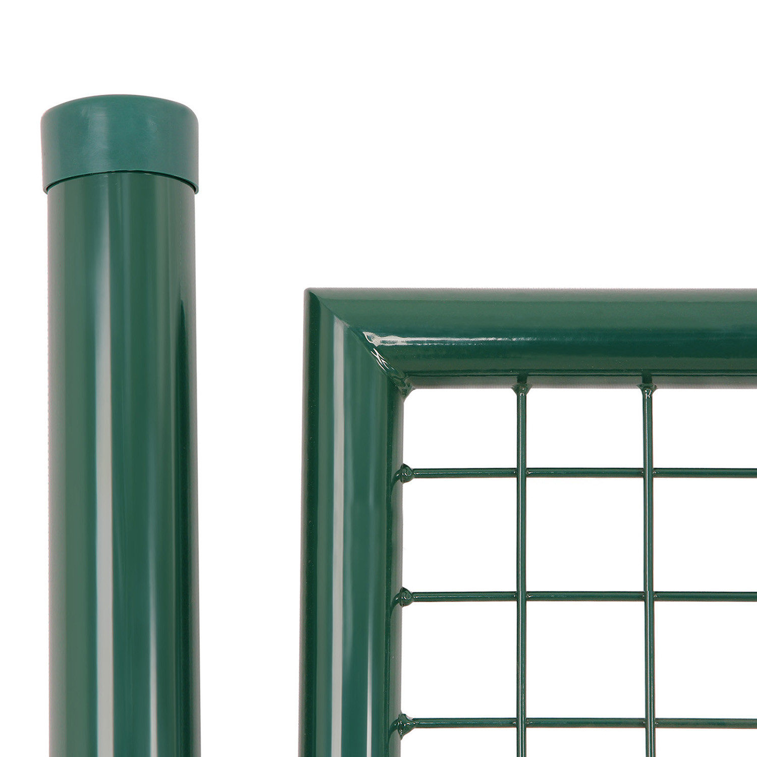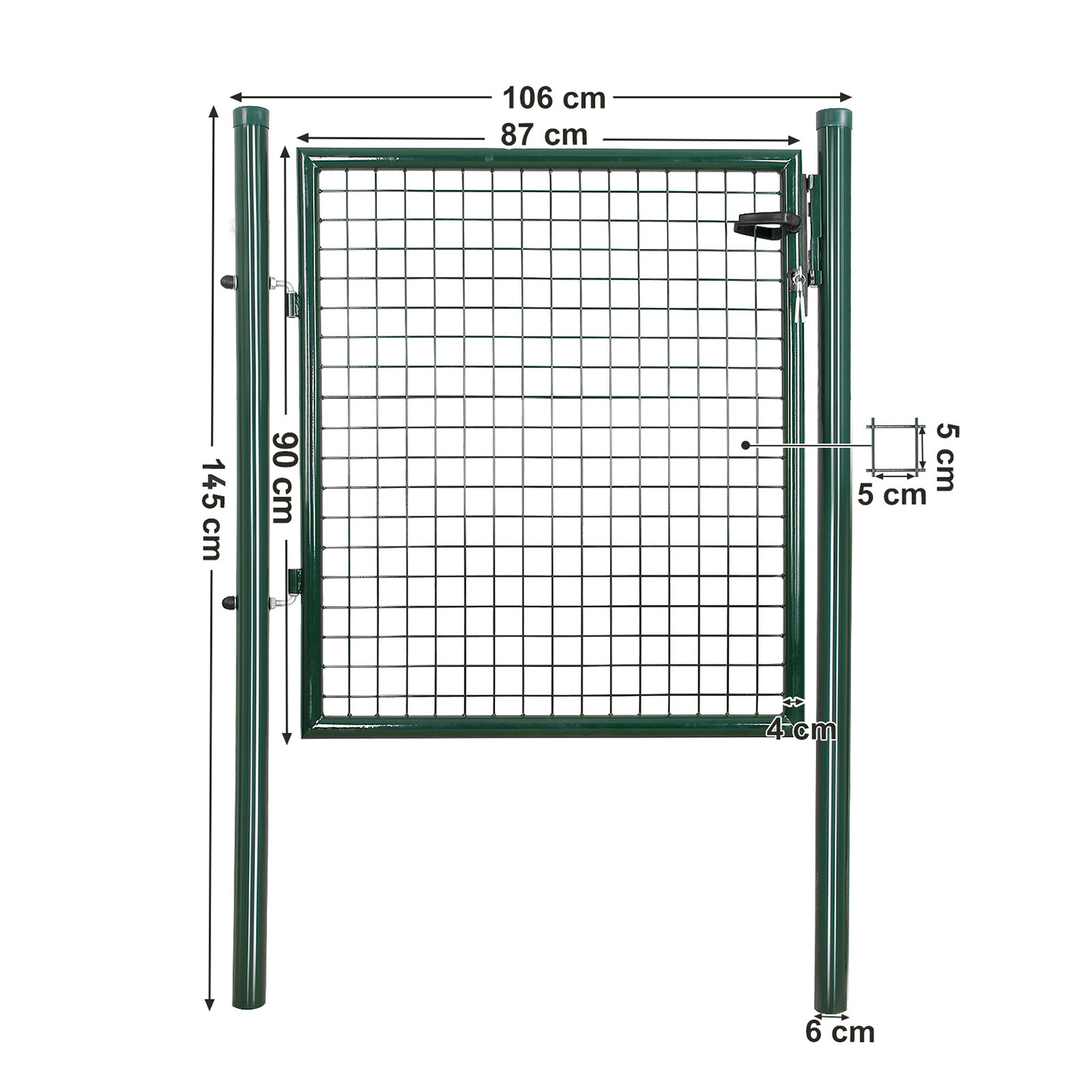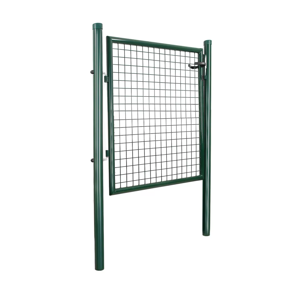Ez a prémium minőségű kerti kapu horganyzott acélból készült, zöld porfestett bevonattal, amely maximális védelmet nyújt a rozsdásodás és korrózió ellen. A masszív szerkezet és az 50 x 50 mm-es rácsszerkezet tökéletes megoldást kínál a kert vagy telek biztonságos lezárásához.