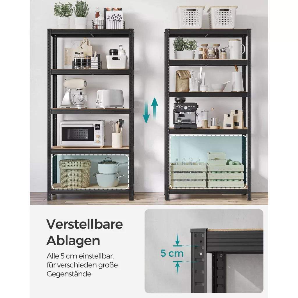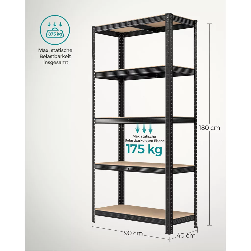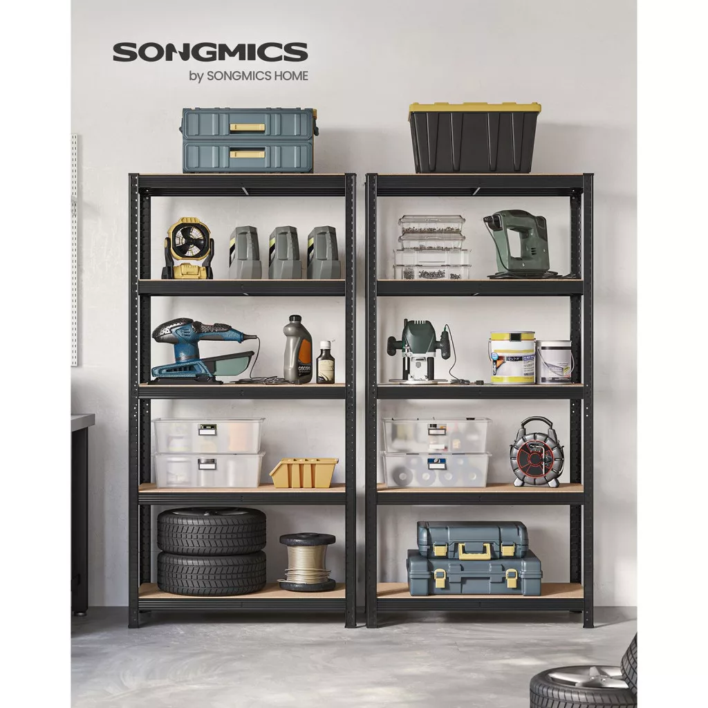 Ez a robusztus, fekete acél polcrendszer szett tökéletes megoldást nyújt a nagyméretű tárolási igényekhez. A két különálló egység összesen 875 kg terhelést bír el, polconként 175 kg teherbírással. Az 5 szintes polcok 5 centiméteres lépésekben állíthatók, így rugalmasan alakítható a tárolt eszközök méretéhez.