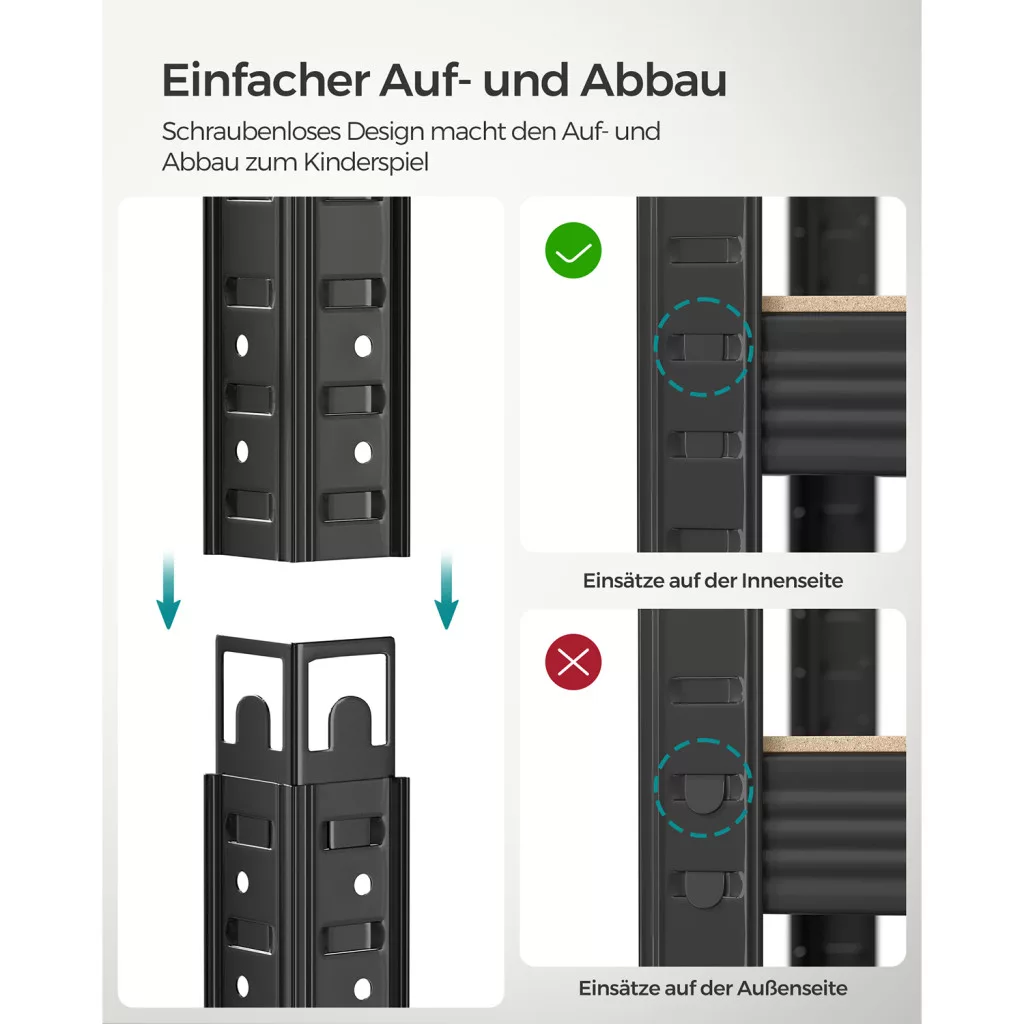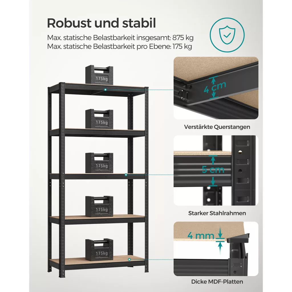 A szerszám nélküli összeszerelés és a stabil acél keret hosszú élettartamot biztosít. A falhoz rögzítő készlet további stabilitást ad, míg az MDF polclapok tartós felületet biztosítanak a tároláshoz.