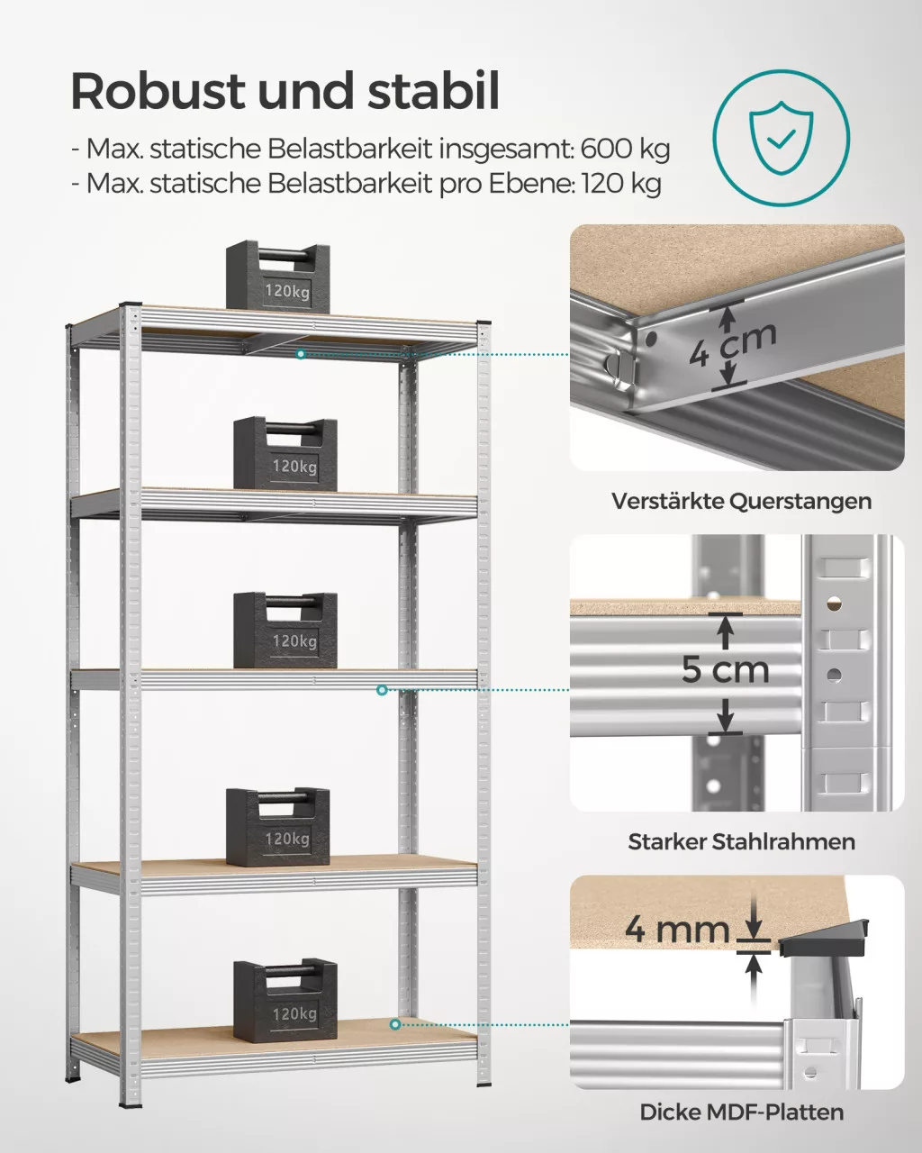 • 600 kg összterhelhetőség, polconként 120 kg teherbírással