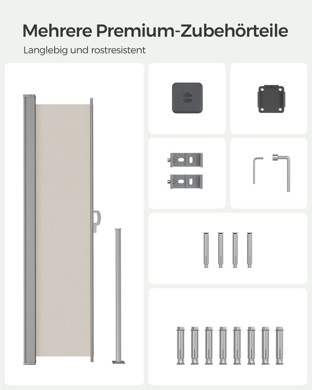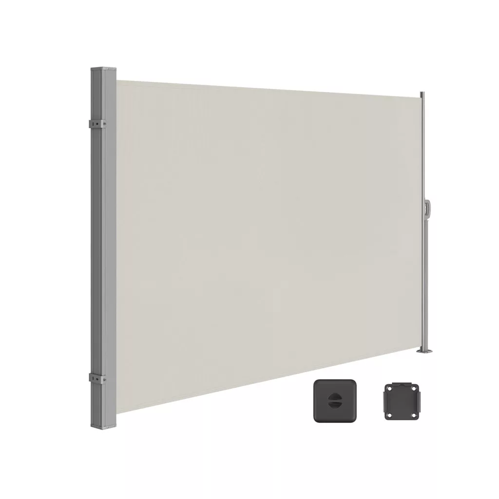 Ez a modern oldalsó napellenző tökéletes megoldást kínál a terasz vagy erkély diszkrét és elegáns árnyékolására. A porszórt fémszerkezetnek és a 220g/m² sűrűségű poliészter vászonnak köszönhetően tartós és időjárásálló védelmet biztosít.