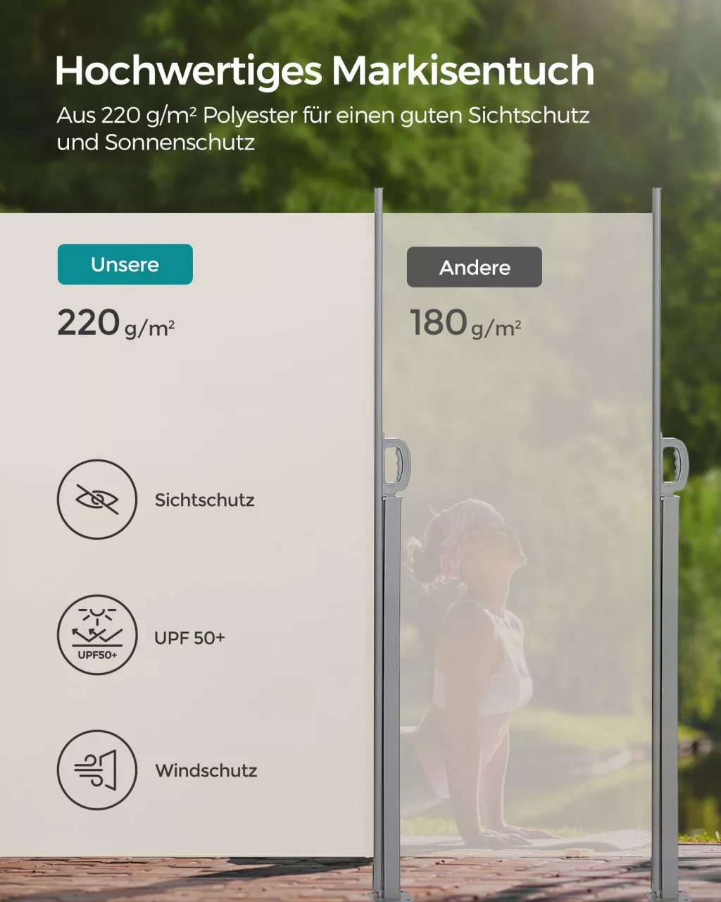 Prémium minőségű, kihúzható oldalsó napellenző teraszokhoz és erkélyekhez, amely tökéletes védelmet nyújt a kíváncsi tekintetek és a nap ellen.