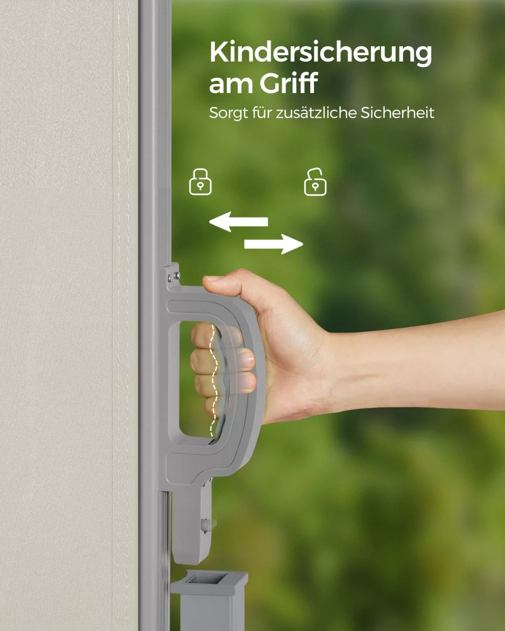 A gyermekzárral ellátott fogantyú és a kétféle telepítési lehetőség maximális biztonságot és rugalmasságot garantál. A prémium minőségű, UV-álló anyag hosszú éveken át megőrzi színét és formáját.
