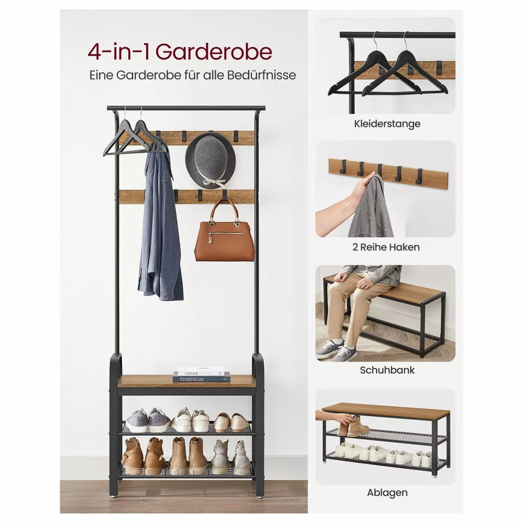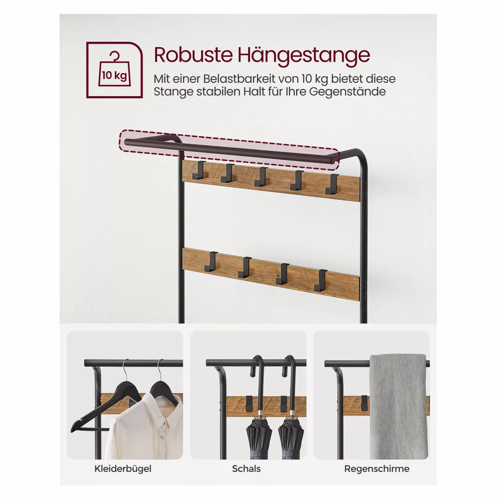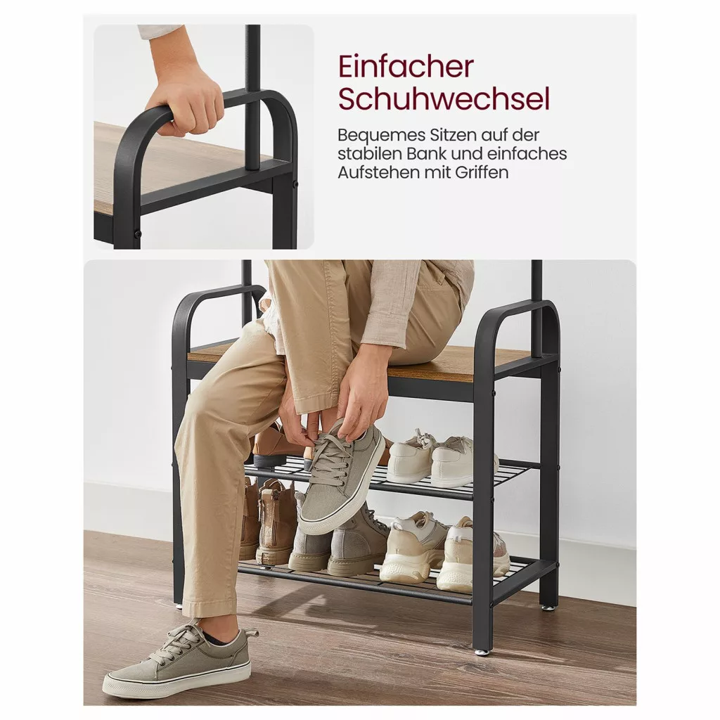A felső ruhaakasztó rúd, a 9 levehető akasztó, a kényelmes ülőpad és a két cipőtároló polc praktikus tárolási lehetőséget kínál kabátok, táskák, cipők és kiegészítők számára. A stabil szerkezet és az időtálló anyaghasználat hosszú élettartamot garantál.