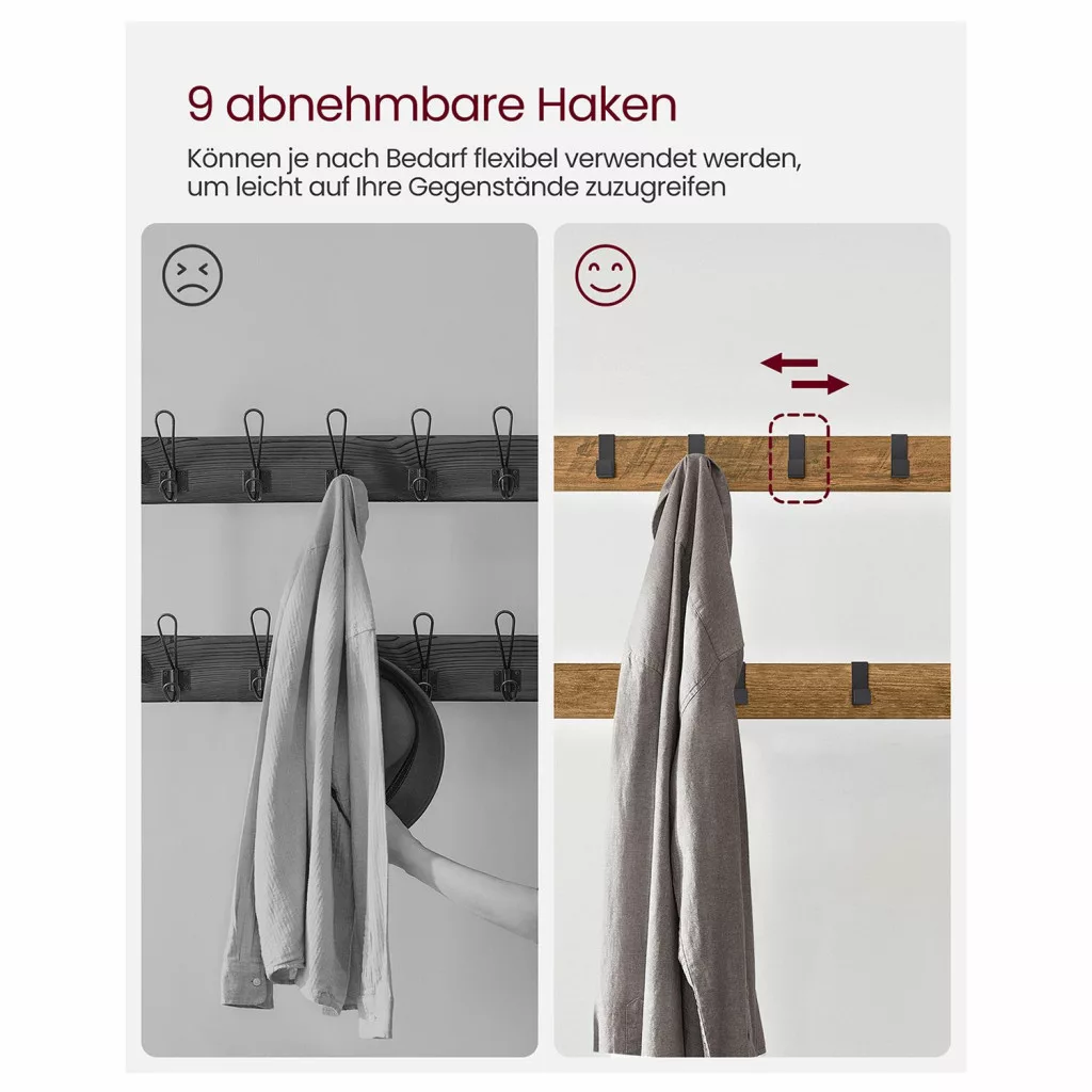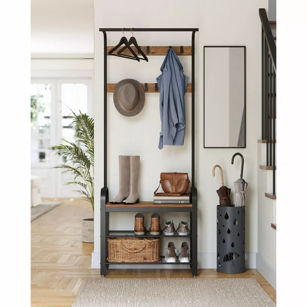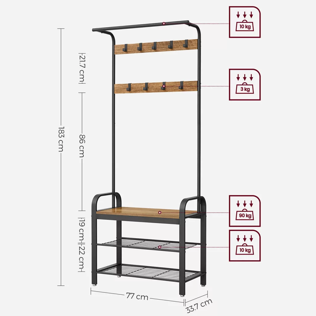 A felső ruhaakasztó rúd, a 9 levehető akasztó, a kényelmes ülőpad és a két cipőtároló polc praktikus tárolási lehetőséget kínál kabátok, táskák, cipők és kiegészítők számára. A stabil szerkezet és az időtálló anyaghasználat hosszú élettartamot garantál.