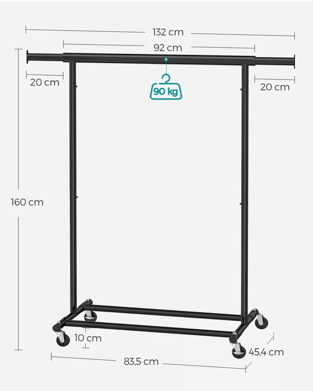 Ez a prémium minőségű ruhaállvány 1 mm vastag acélcsövekből készült, ami kiemelkedő, 90 kg-os teherbírást biztosít. A kihúzható felső rúd 92 cm-ről 132 cm-re bővíthető, így rugalmasan alakítható a tárolótér az aktuális igényekhez.