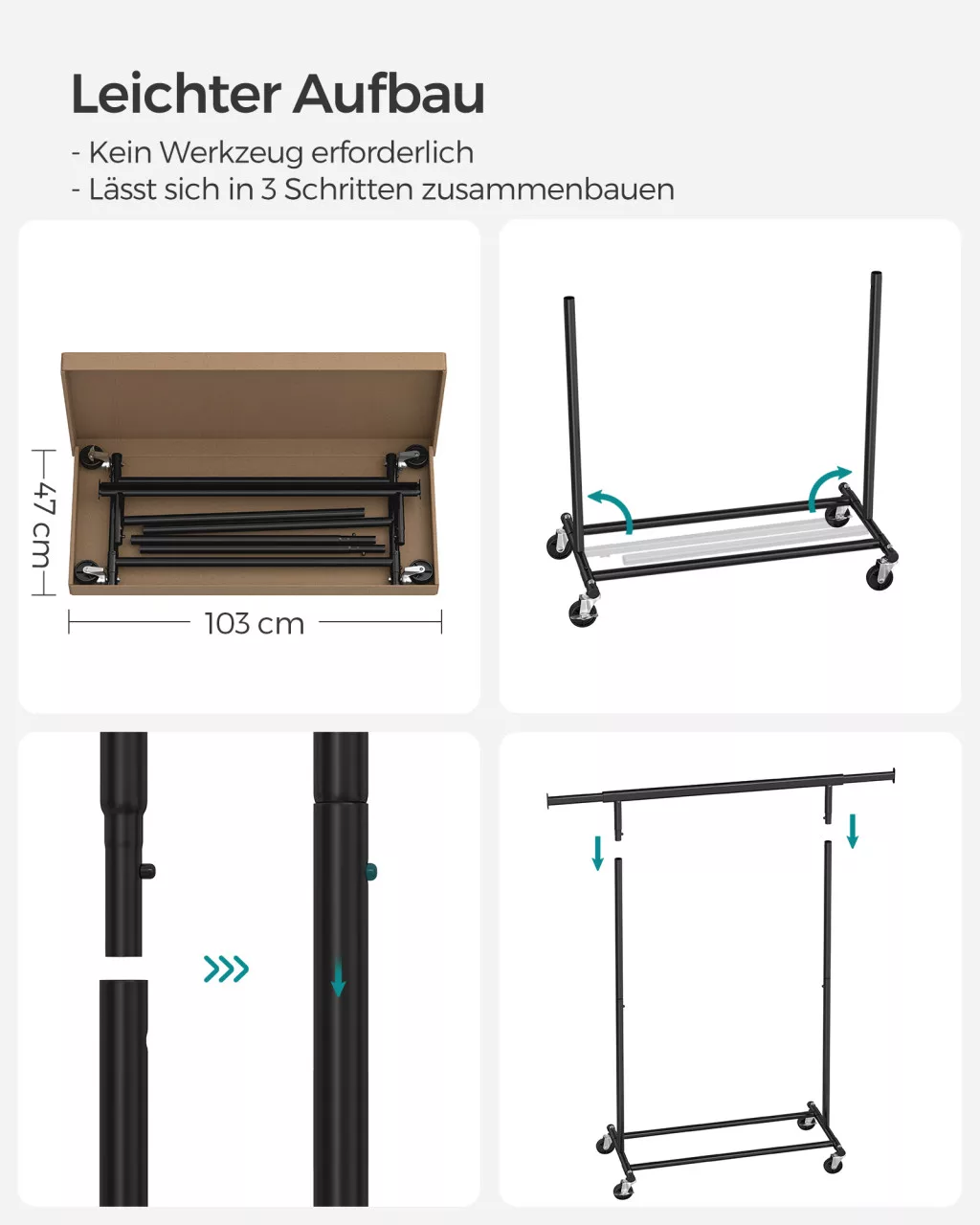 A négy 360 fokban elforduló kerék, melyből kettő rögzíthető, könnyű mozgathatóságot biztosít. Az alsó tárolórudak további tárolódobozok elhelyezését teszik lehetővé, így maximálisan kihasználható a rendelkezésre álló tér.