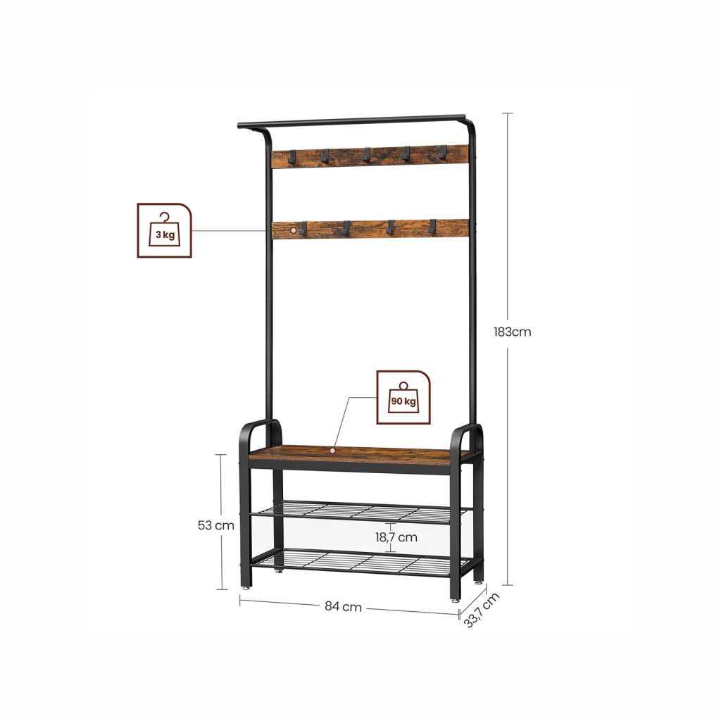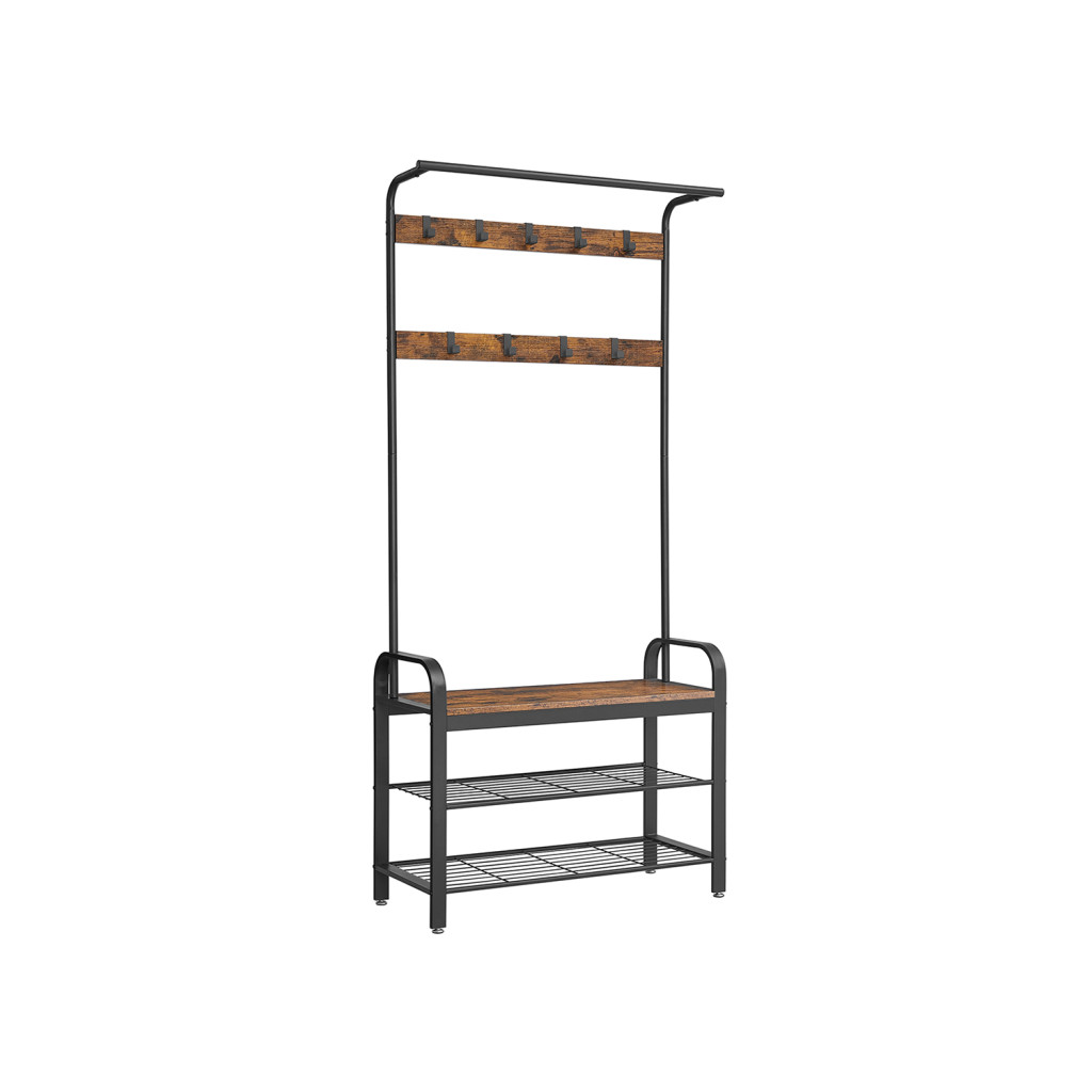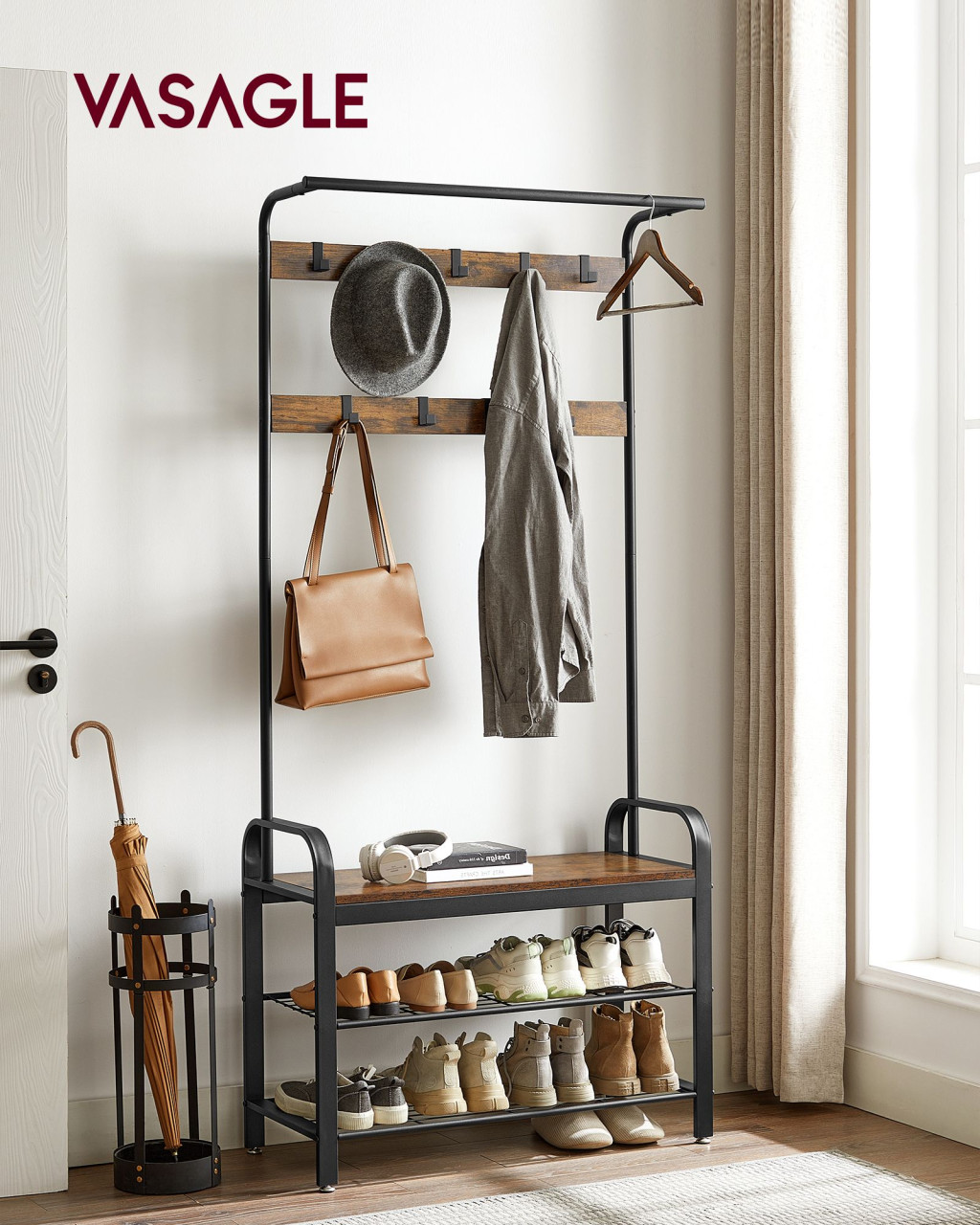 VASAGLE Industrial 4-az-1-ben Előszobai Állvány Cipőspolccal Rusztikus Barna-Fekete