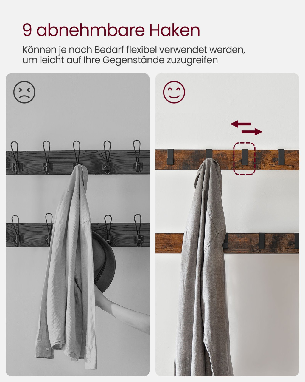 Ez a stílusos, ipari dizájnú előszobai állvány egyesíti magában mindazt, amire egy rendezett előszobában szükség lehet. A felső ruhaakasztó rúd, a 9 levehető akasztó, a kényelmes pad és a kétszintes cipőtároló polc praktikus megoldást kínál a mindennapi ruházat és kiegészítők tárolására.