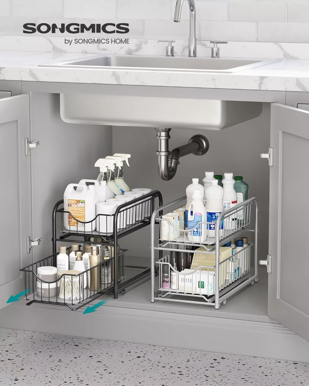 SONGMICS 2-szintes Mosogató Alatti Tárolórendszer Kihúzható Kosarakkal Fekete