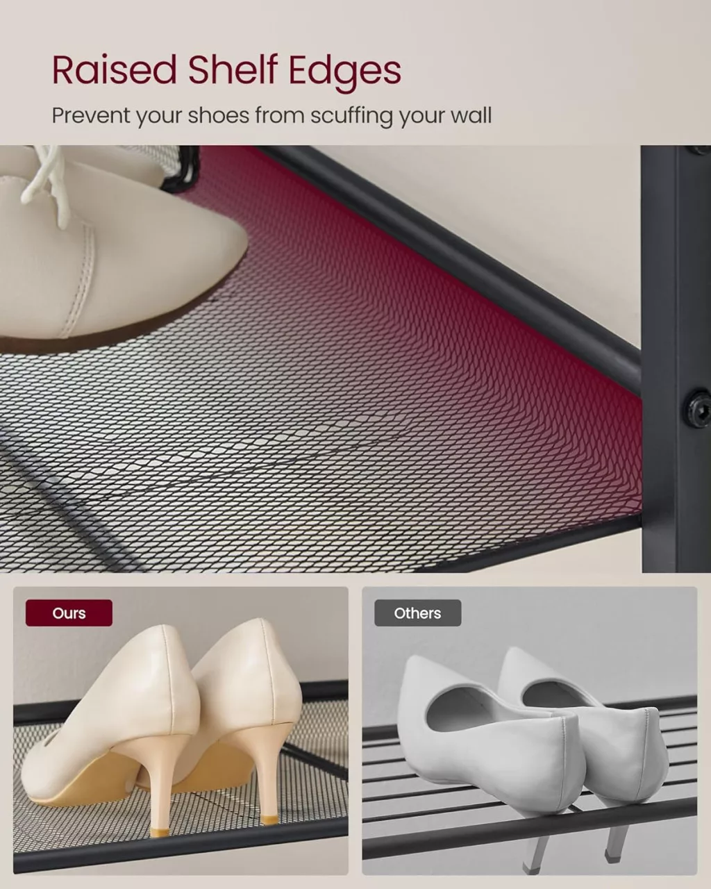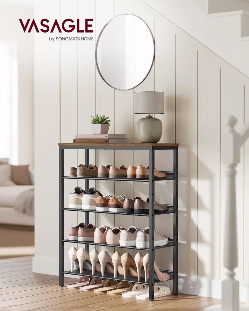 Stílusos és praktikus 5-szintes cipőtároló állvány acél hálós polcokkal és nagy teherbírású felső rakodófelülettel, amely tökéletes megoldást nyújt az előszobai cipőtároláshoz.
