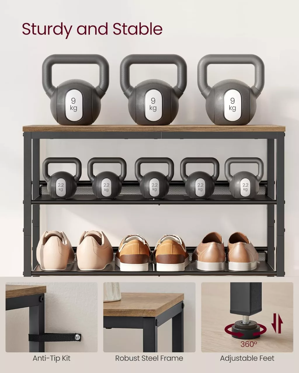 A robusztus acél szerkezet és a minőségi faforgácslap felső polc tartós használatot garantál. A polcok dönthető kialakítása lehetővé teszi a cipők optimális elrendezését, míg a megemelt peremek megakadályozzák a fal beszennyeződését.