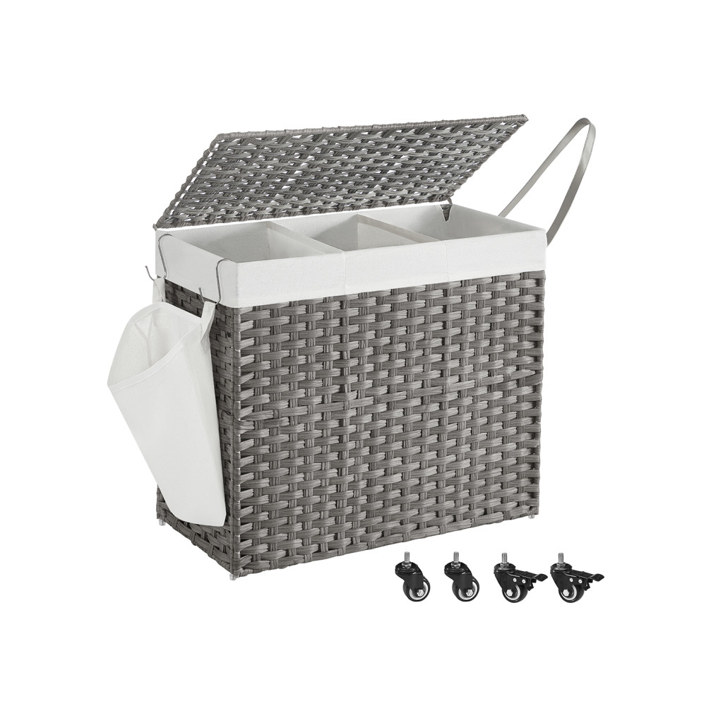 Praktikus, 160 literes szennyestartó kosár három rekesszel, kivehető mosózsákkal és görgőkkel a könnyű mozgathatóságért. Rattan hatású kivitelben, szürke színben.