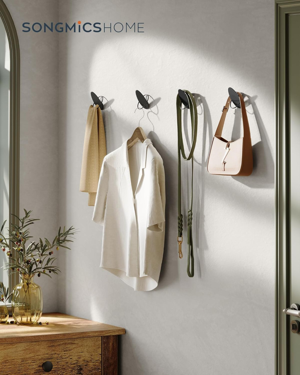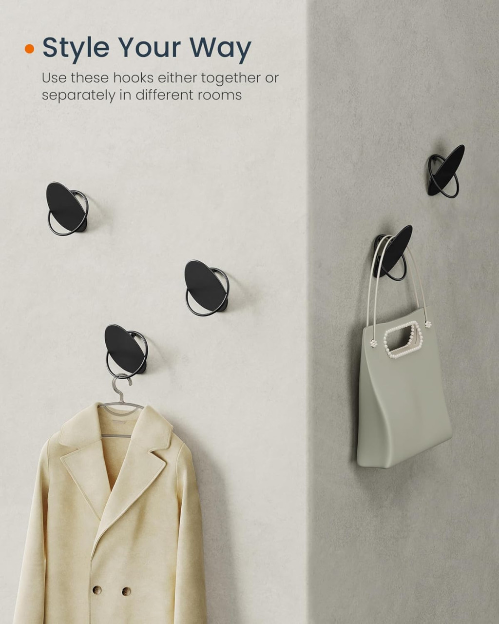 A SONGMICS HOME tojás alakú fali akasztói ötvözik a modern dizájnt és a praktikus funkcionalitást. A minőségi acélból készült, rozsdaálló bevonattal ellátott akasztók egyenként 5 kg teherbírással rendelkeznek, így megbízható tárolási megoldást nyújtanak kabátok, táskák és egyéb kiegészítők számára.