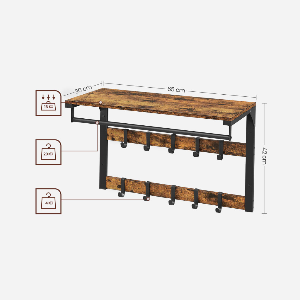 Ez a rusztikus barna fali fogas tökéletes megoldást nyújt az előszobai vagy mosóhelyiségi tároláshoz. A felső polc, a ruhaakasztó rúd és a 10 állítható kampó maximális rugalmasságot biztosít a kabátok, táskák és kiegészítők rendszerezett tárolásához.