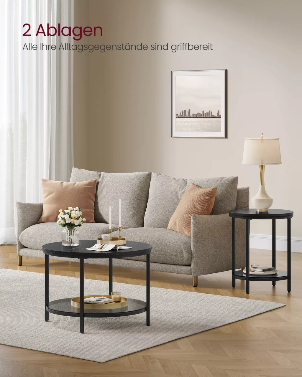 Ez a VASAGLE dohányzóasztal a modern elegancia megtestesítője. A márvány hatású fekete asztallap és az alatta elhelyezkedő edzett üvegpolc tökéletes összhangot alkotnak a fekete acél lábszerkezettel. A minimalista dizájn mellett az asztal praktikus tárolási lehetőséget is kínál.