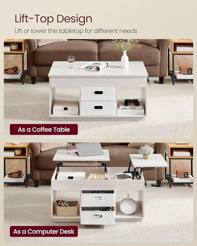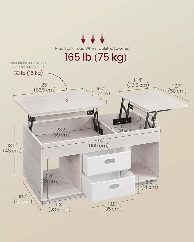 VASAGLE Emelhető Tetejű Dohányzóasztal Tárolófiókokkal Zabkása Bézs