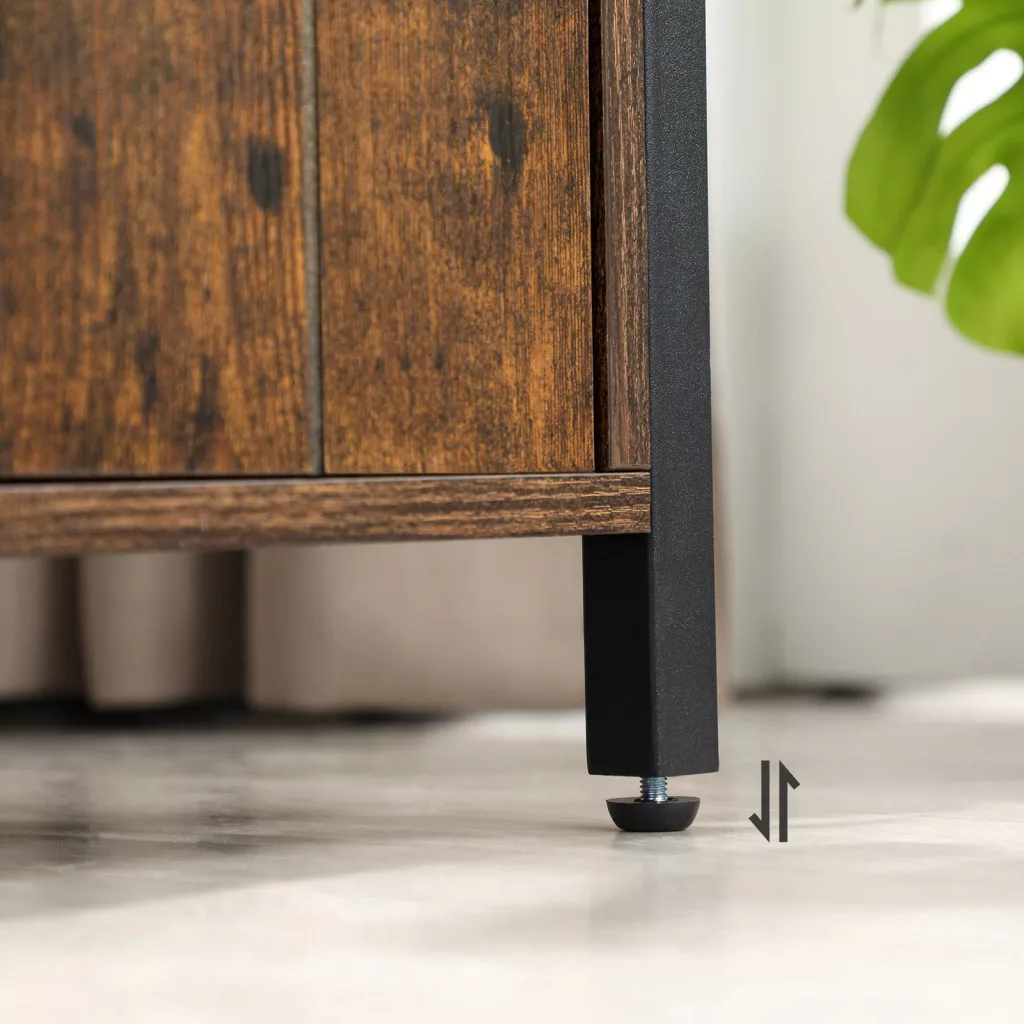 A szekrény belsejében két szint áll rendelkezésre, ideális könyvek, magazinok vagy személyes tárgyak tárolására. A dekoratív rácsos oldalpanelek és az állítható lábak tovább fokozzák a bútor praktikusságát és stílusát.