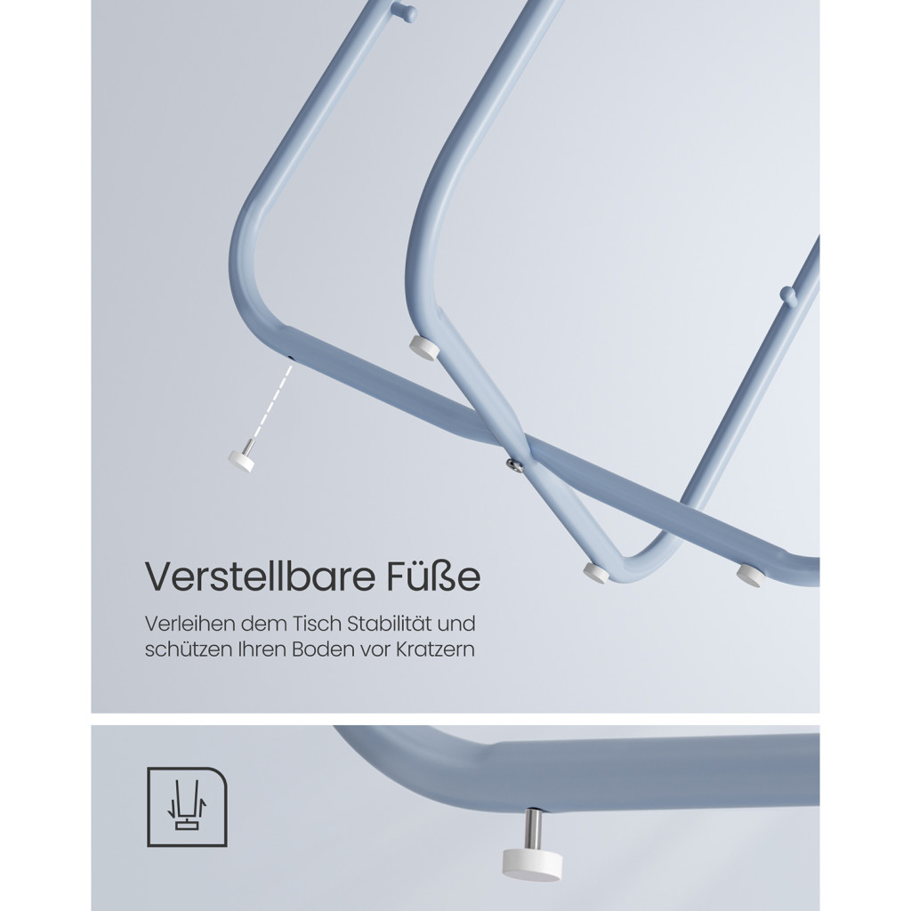 A pasztellkék színvilág és a modern dizájn tökéletesen illeszkedik a kortárs lakberendezési stílusokhoz. A stabil acél váz és az állítható lábak garantálják a megbízható használatot, míg a minőségi poliészter kosár praktikus tárolóhelyet biztosít.