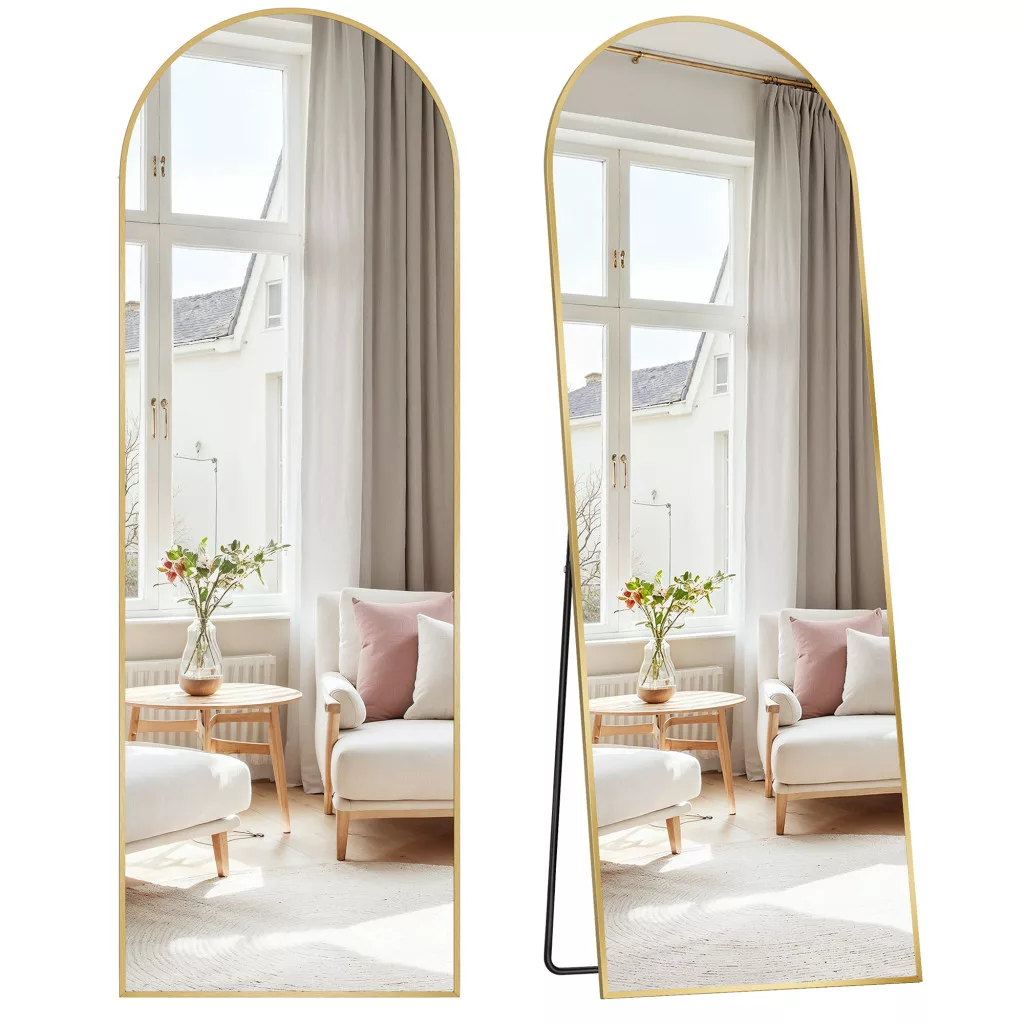 SONGMICS teljes alakos tükör 160 x 50 cm íves alumínium kerettel edzett üveg halvány arany