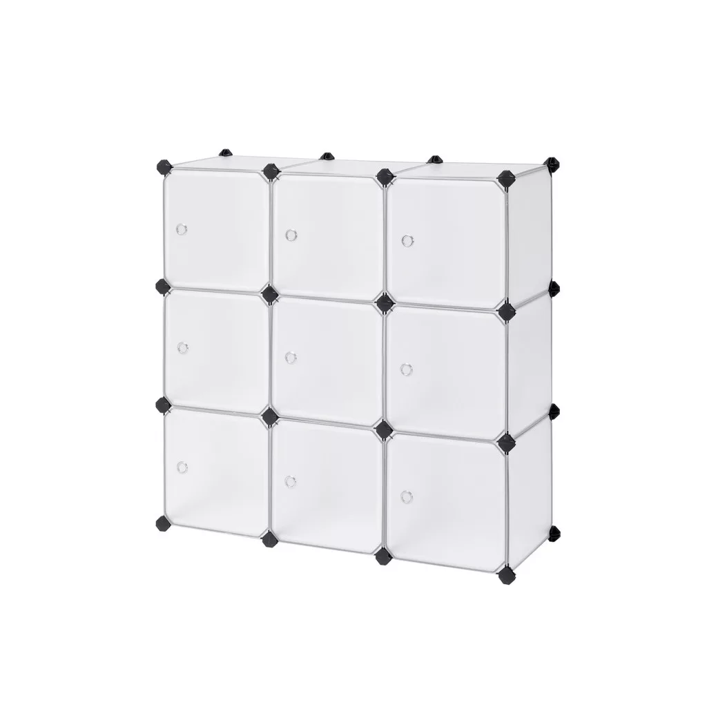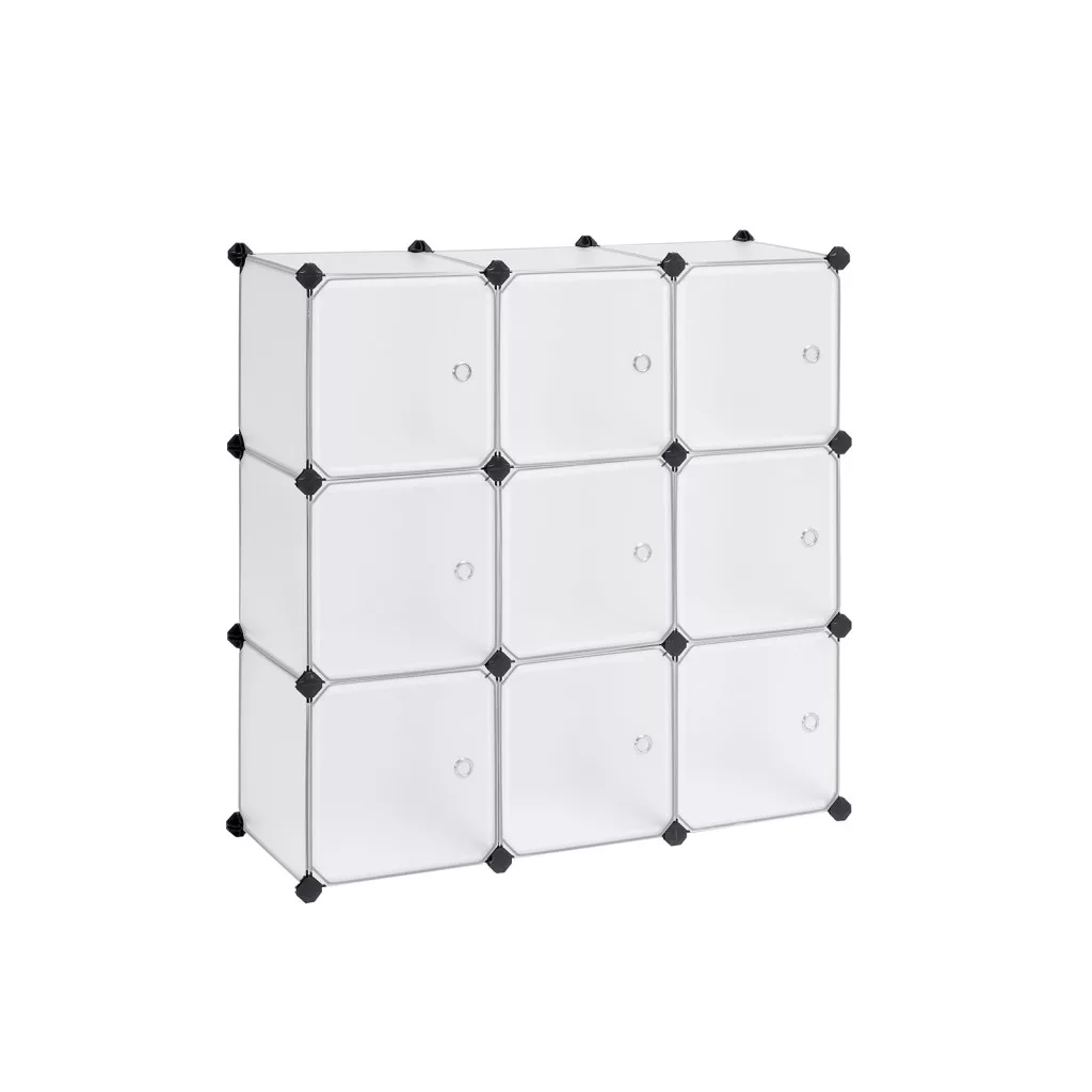 Ez a praktikus moduláris tárolórendszer tökéletes megoldást nyújt a rendezett otthoni környezet kialakításához. A 9 egyforma méretű, ajtóval ellátott rekesz rugalmas tárolási lehetőséget biztosít ruhák, cipők, játékok és egyéb használati tárgyak számára.