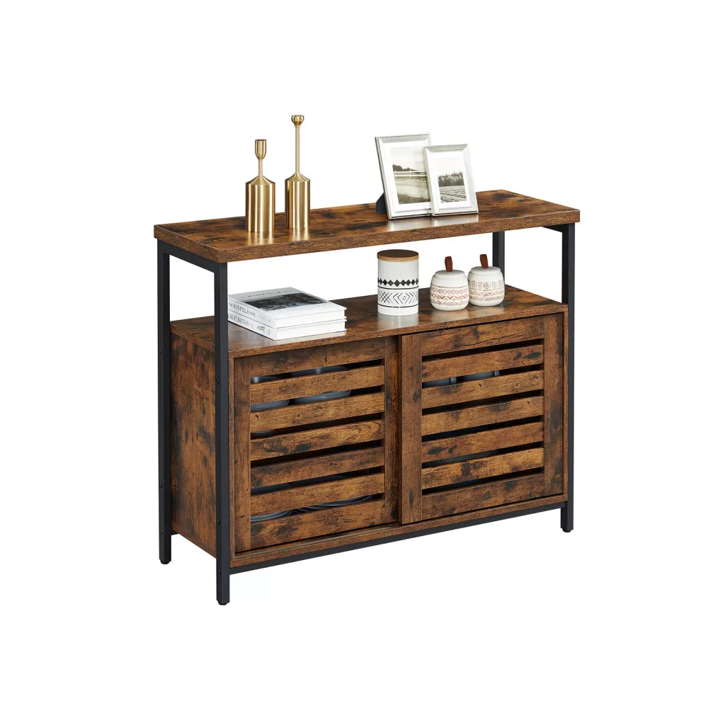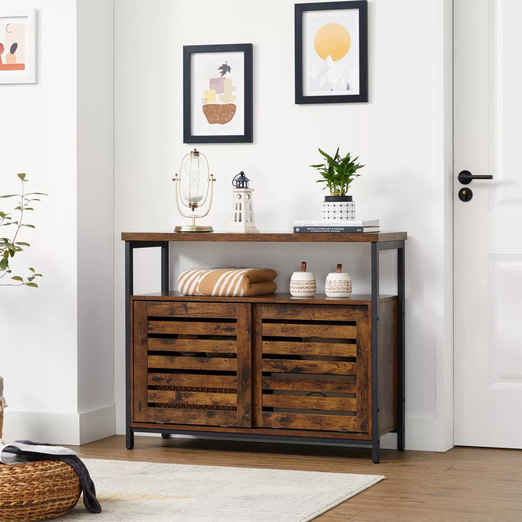 VASAGLE Lowell Ipari Stílusú Tálalószekrény Tolóajtóval Rusztikus Barna-Fekete