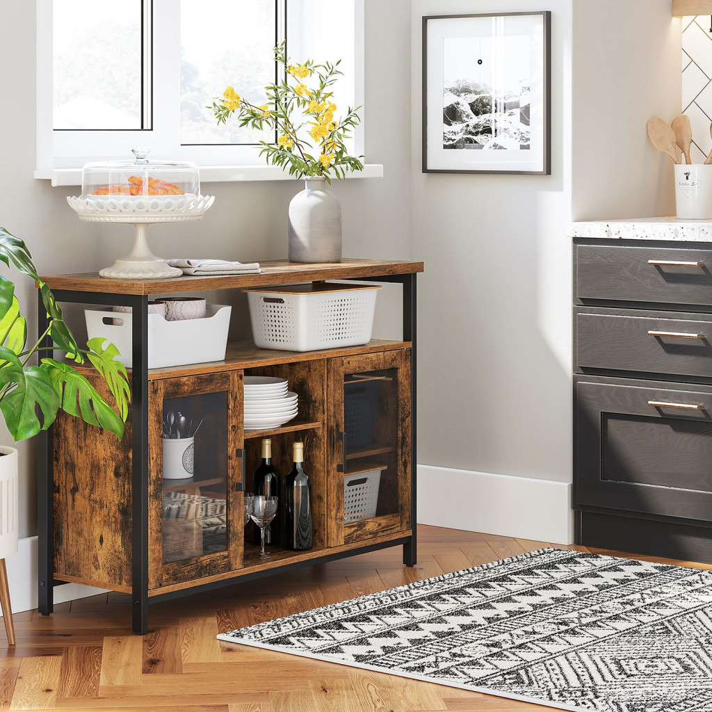 VASAGLE Ipari Stílusú Tálaló Szekrény Üvegajtókkal Rusztikus Barna-Fekete