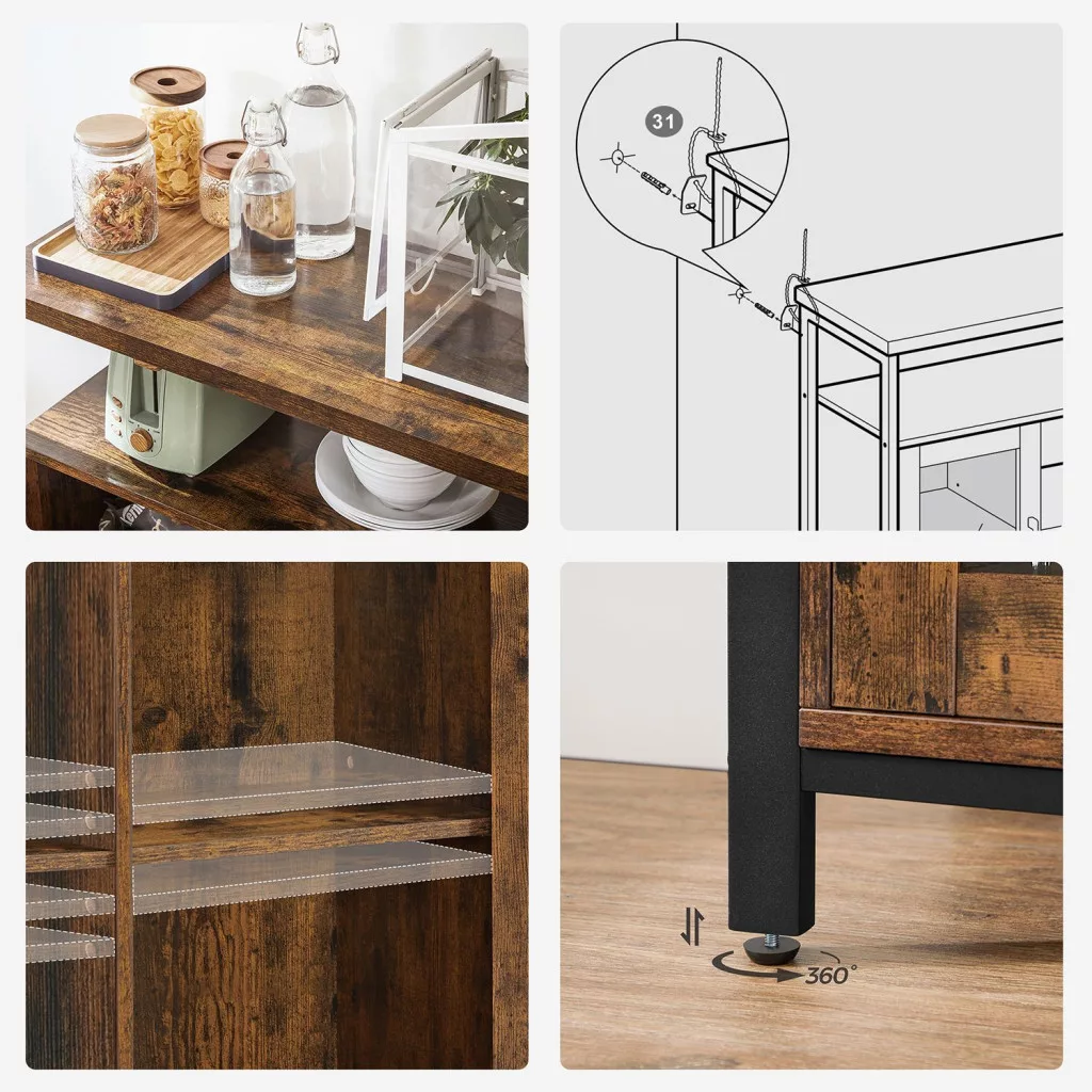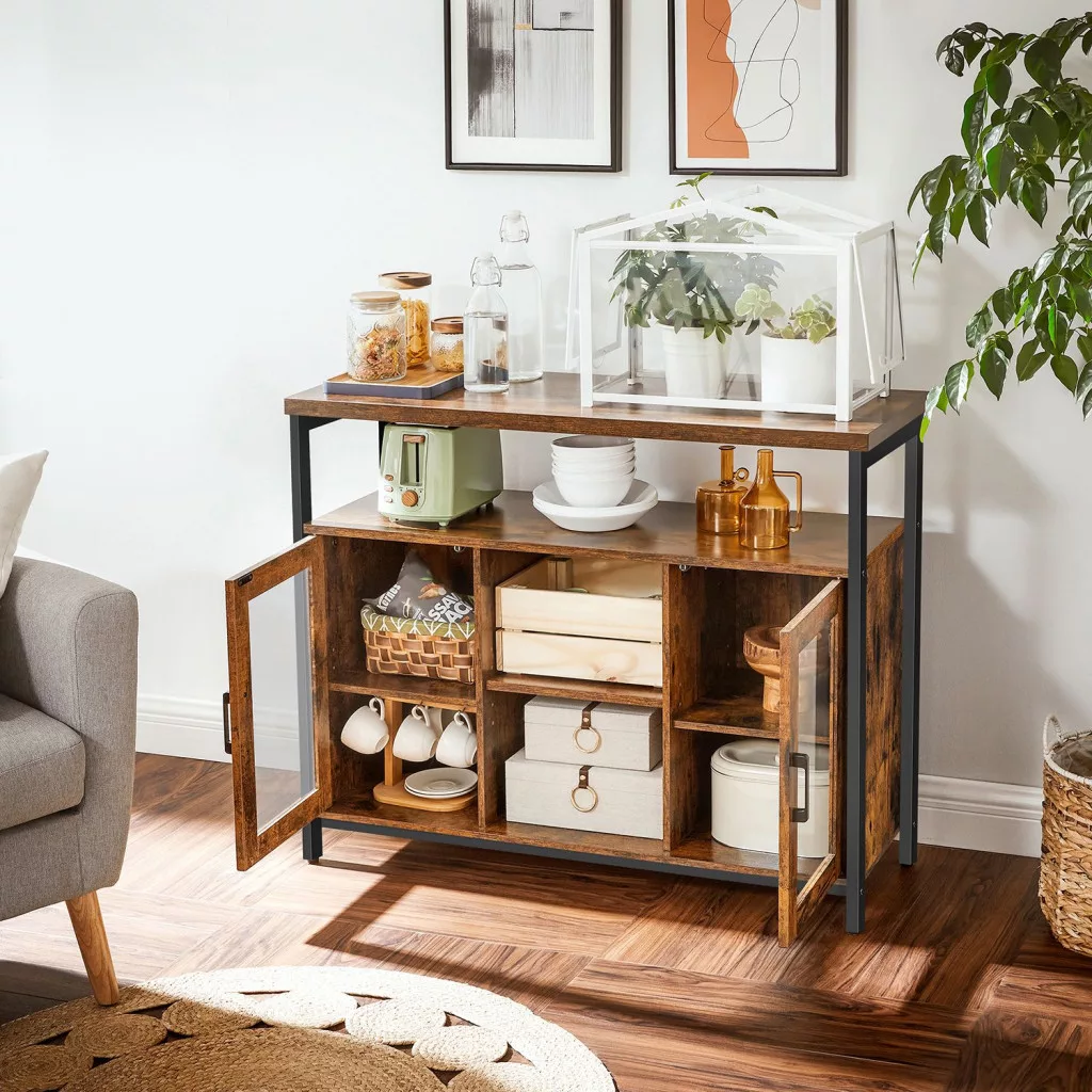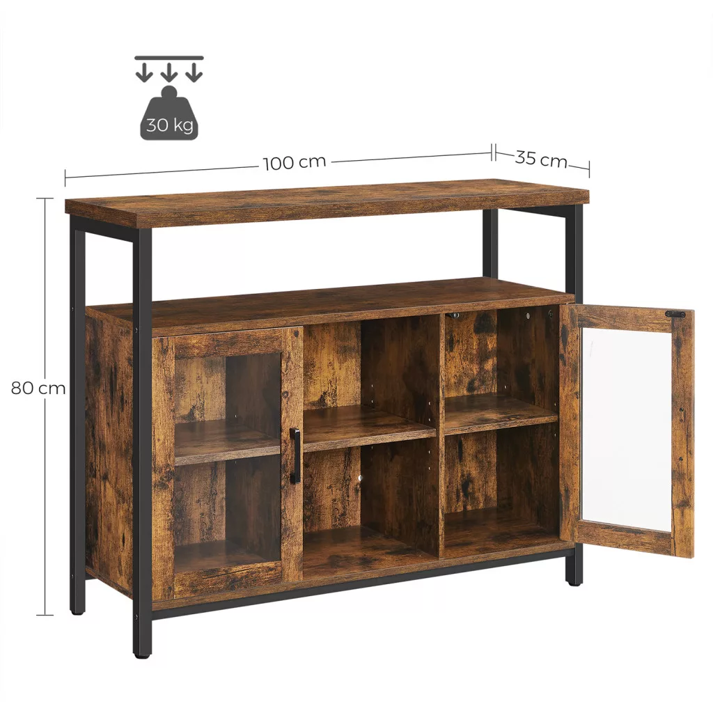 Ez a VASAGLE tálaló szekrény tökéletesen ötvözi a funkcionalitást és az ipari dizájnt. A rusztikus barna felületek és a fekete acélváz harmonikus kombinációja modern industrial megjelenést kölcsönöz, míg az üvegajtók elegáns betekintést engednek a tárolt tárgyakra.