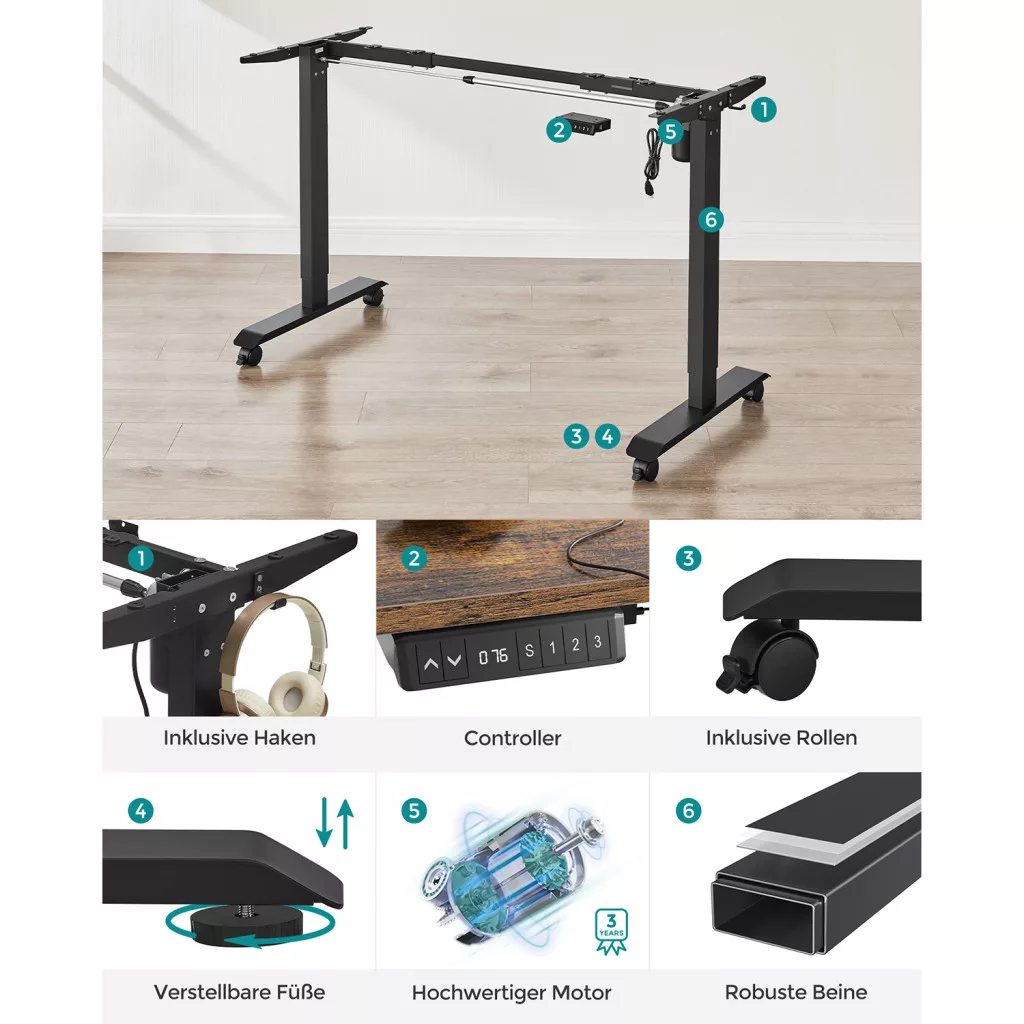 Ez a prémium minőségű elektromos íróasztal egyesíti a funkcionalitást és a stílust. A vintage barna asztallap és a fekete acél váz modern megjelenést kölcsönöz, miközben a csendes motorral működő magasságállítás lehetővé teszi a zökkenőmentes váltást az ülő és álló munkavégzés között.