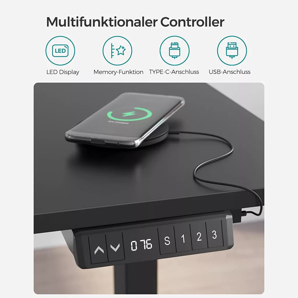 Az asztal különleges tulajdonsága a 3 pozíciós memória funkció, valamint az USB és TYPE-C csatlakozó, ami kényelmes töltési lehetőséget biztosít. A beépített ütközésvédelem és a görgős kivitel pedig maximális biztonságot és mobilitást garantál.