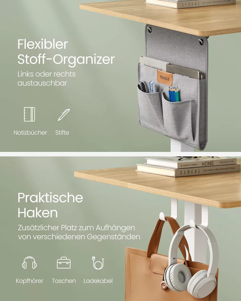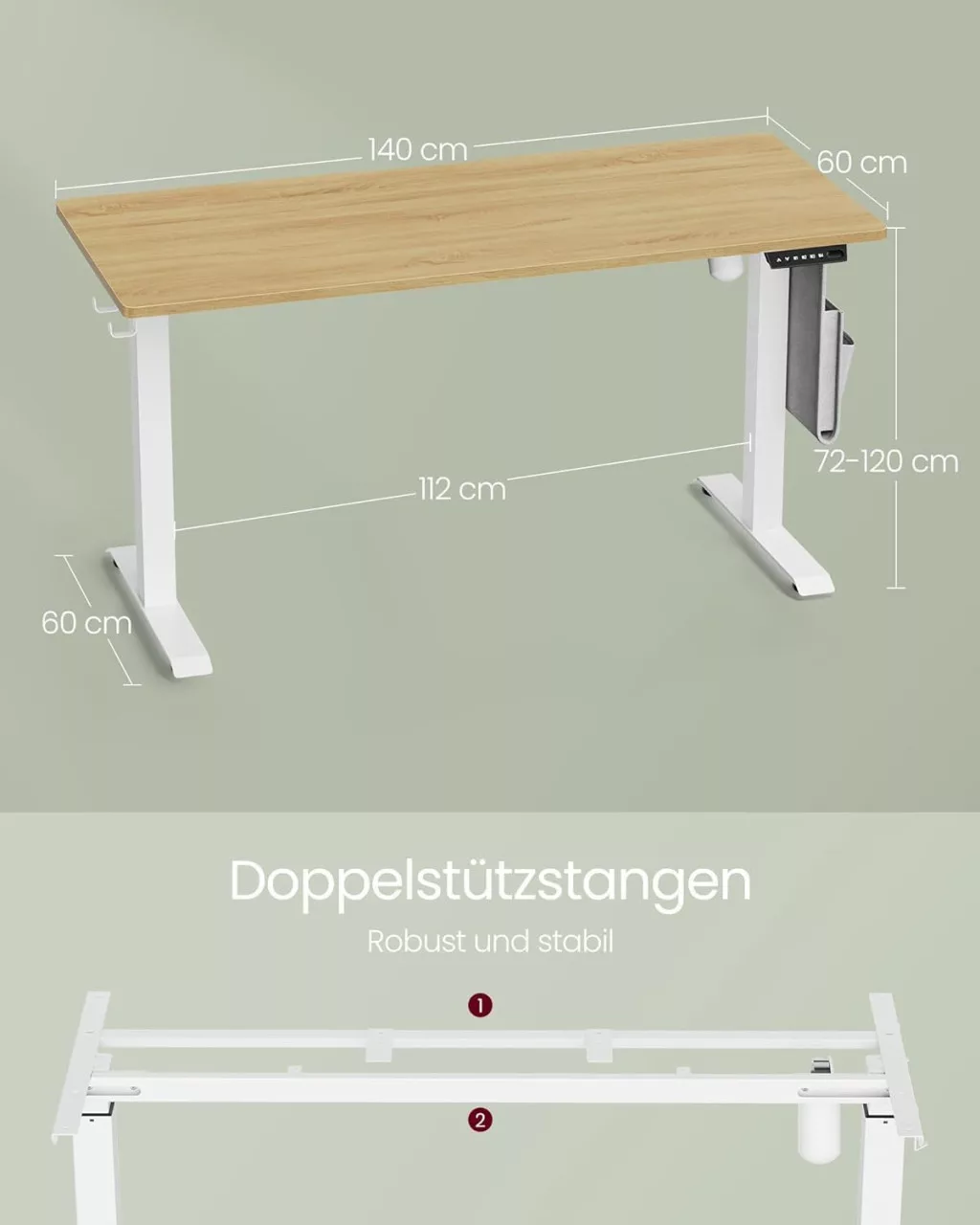Az asztal praktikus kiegészítőkkel van felszerelve, mint például az Oxford szövetből készült oldalsó rendszerező, akasztók a fejhallgatóknak és táskáknak, valamint beépített USB töltőport. A dupla támasztórúd és az acél lábszerkezet stabil munkakörnyezetet biztosít akár 80 kg terhelésig.