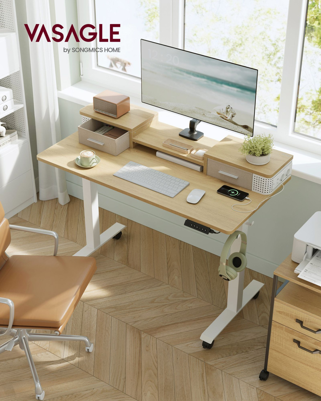 VASAGLE Smart Elektromos Állítható Magasságú Íróasztal Monitortartóval Szalmasárga