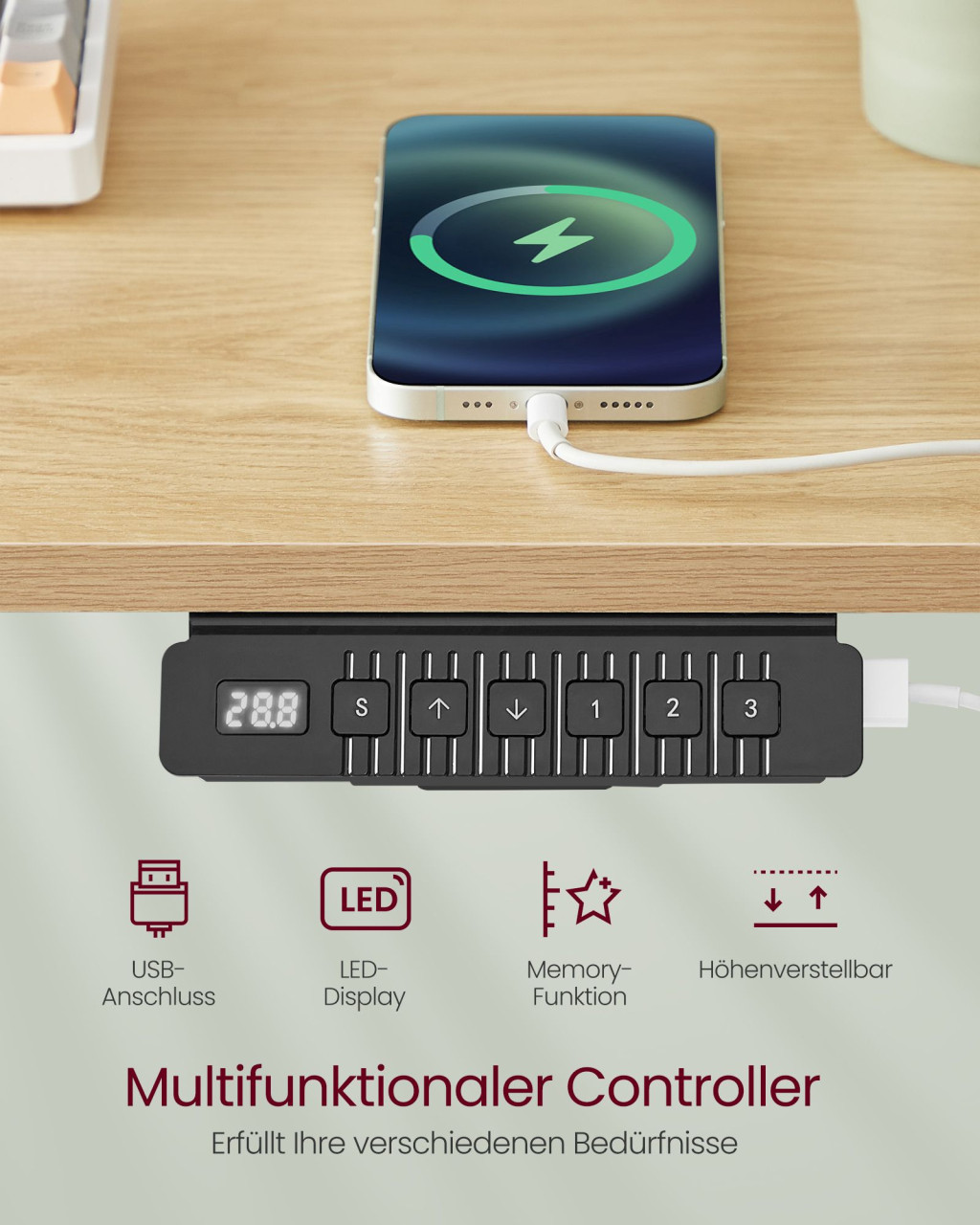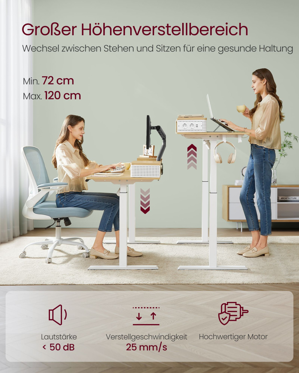 • Egészséges munkavégzés az elektromosan állítható magasságnak köszönhetően