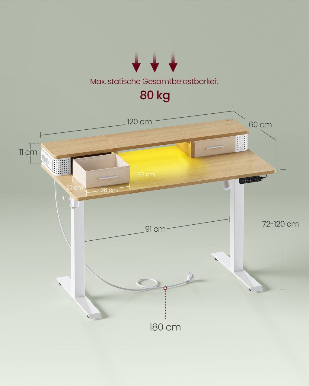 Az asztal kiváló minőségű motorja halk működést és akadályérzékelő védelmet garantál. A beépített LED világítás, USB töltőportok és elektromos csatlakozók minden szükséges eszköz kényelmes használatát teszik lehetővé. A stabil acélváz és a kettős támasztórúd rendszer biztosítja a masszív tartást akár 80 kg terhelésig.