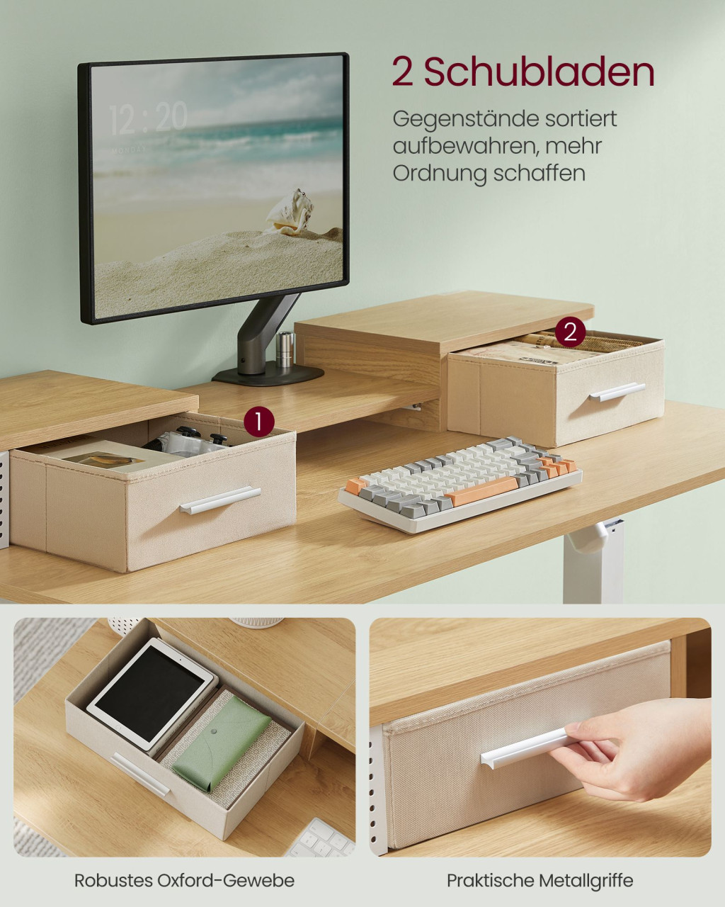 • Monitortartó rendszer: Állítható magasságú polc tárolófiókokkal