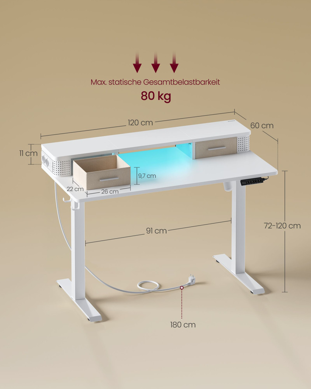 A minőségi acél váz és a dupla támasztórúd rendkívüli stabilitást biztosít, míg a csendes motor (<50dB) zökkenőmentes magasságállítást tesz lehetővé. A beépített LED világítás, kábelrendező megoldások és praktikus kiegészítők, mint a fejhallgató tartó, modern és rendezett munkakörnyezetet teremtenek.