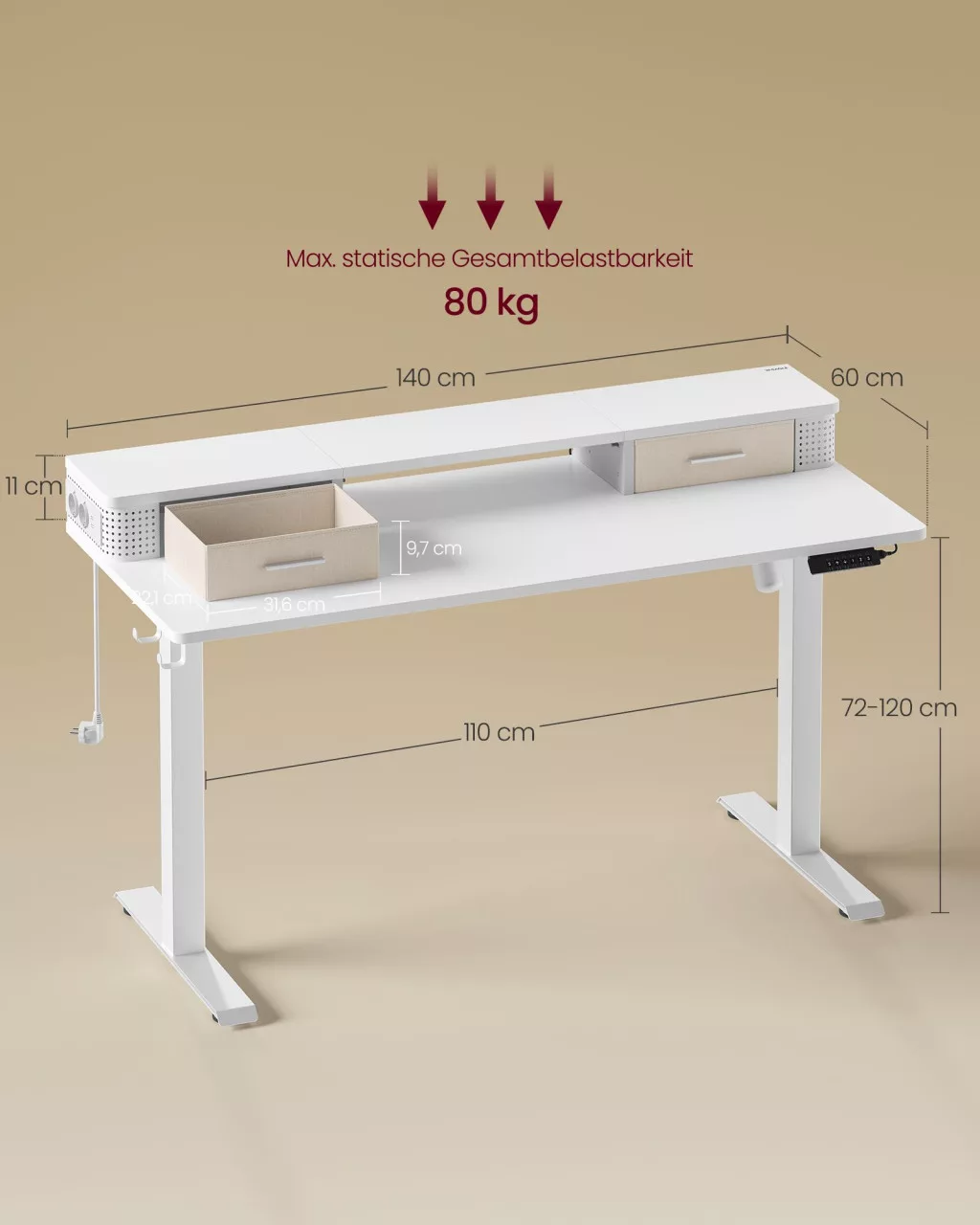 A kiváló minőségű motor halk működést (50dB alatt) és egyenletes magasságállítást biztosít, míg az ütközésérzékelő funkció megvédi az asztalt a sérülésektől. A dupla merevítőrúddal ellátott acél váz 80 kg teherbírást garantál.